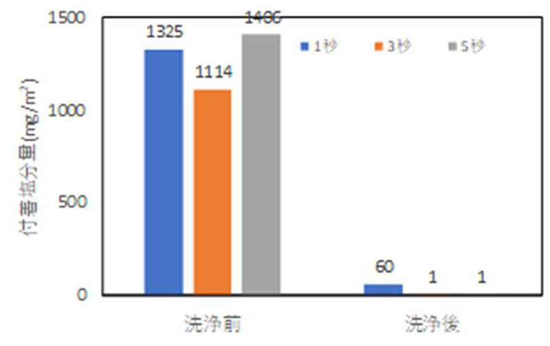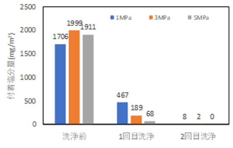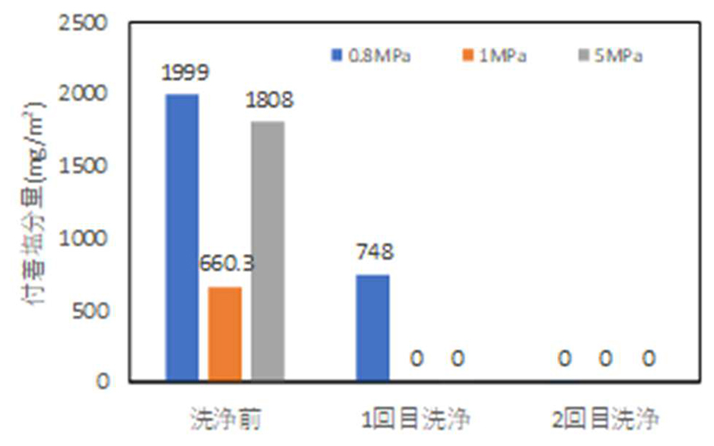 UFB水による洗浄試験結果は、洗浄前が337.3mg/㎡、第1回目終了時25.0 mg/㎡、第2回目終了時5.9 mg/㎡、第3回目終了時7.6 mg/㎡、第4回目終了時5.9 mg/㎡、第5回目終了時5.7 mg/㎡と1回目で塩分除去率92.6%ではあるが、その後は横ばい状態で完全除去とはならなかった。