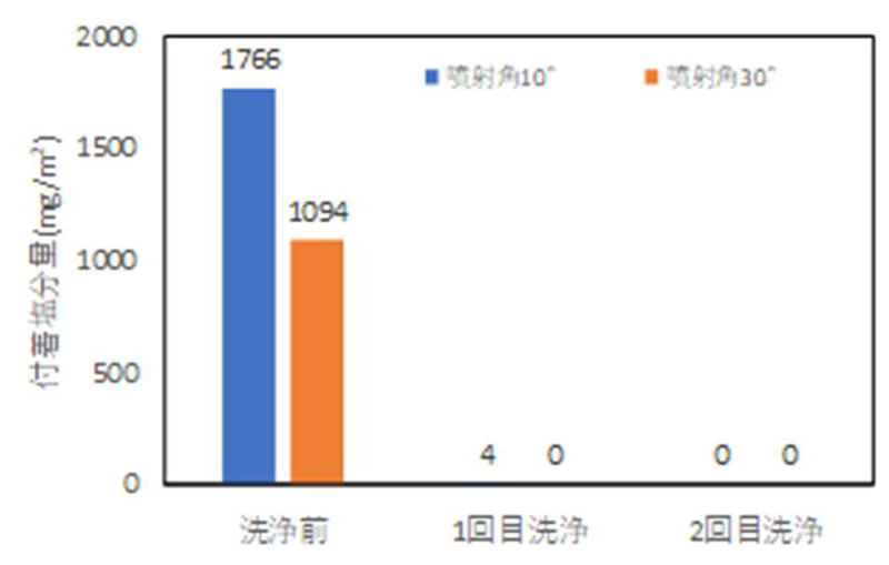 UFB水による洗浄で、噴射角を大きくすることによって、一度に洗浄できる面積が広くなることから作業の効率が上昇する。しかし、噴射角を大きくすると洗浄水が広範囲に拡散するため、洗浄面に働く水の衝突圧が低下し、洗浄効果が低下する可能性がある。そこで、噴射角の違いが洗浄効果に与える影響について洗浄効果確認試験を行った。なお、噴射角は10、30°の2種類で、吐出圧力1Mpa、離隔距離1.0m、1回の洗浄時間3秒で行った。噴射角の影響に関する洗浄試験結果を図-17に示すが、噴射角10°、30°のいずれも1回目の洗浄で塩分を除去できており、この程度の噴射角の違いでは洗浄効果に影響しないことが確認できた。