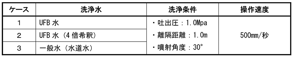 なお、UFB水洗浄試験施工の条件は、第2回の試験施工結果及び試験鋼板試験施工結果から、対象物までの離隔距離;1.0m、吐出圧;1.0MPa、ノズル噴射角;30°で行った。試験施工の方法と条件を表‐1に示す。