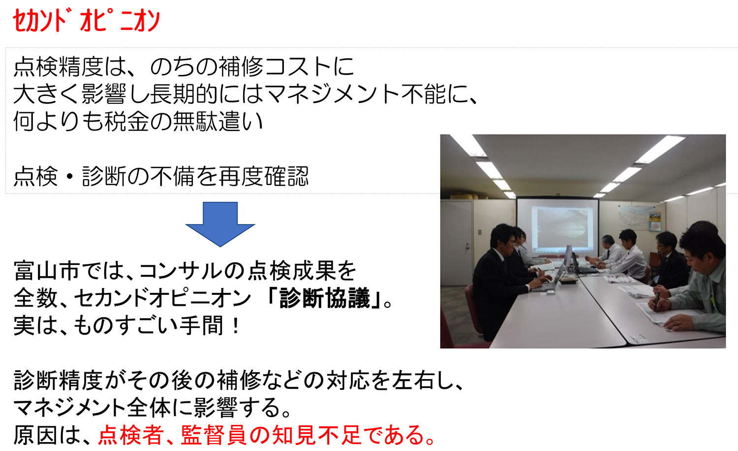 とにかく制度や仕組みの話は、考えてもらうとして、我々がやるべきは、第2ステージでは、如何に補修していくか・その後の全体のマネジメントをどう考えていくかを決める時期になる。そうすればおのずと包括管理も群管理も見えてくる。そしていかに新技術を導入していくか?新技術を導入するということは、点検の質を上げていくことにも通ずる。非破壊検査法などの活用も重要である。より損傷を深い部分で確認する必要もある。