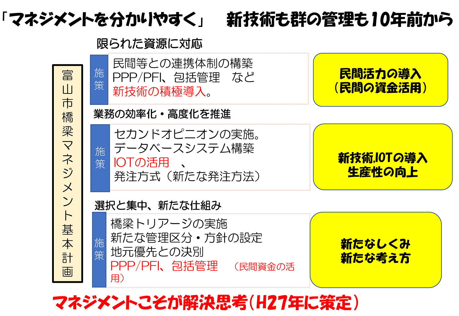これまで、様々な政策を構想し取り組んできたが、そのたびに批判された。まずは「橋梁トリアージ」「補修オリンピック」「再劣化」・・・・とさまざまであった。が結果10年たってみれば、それぞれそれなりに評価されている。これらは実は、「富山市橋梁マネジメント基本計画」の中の1つ1つの、1項目なのである。全体のマネジメント計画の中でやるべき施策として挙げたものである。全体の目的が有って、それを実現するために、作戦的な項目である。戦略を考え戦術を示すこれが、重要である。これが、ごっちゃになっている。1つの戦術では、目的は達成できないが1つにこだわってしまうのが、この国の姿。マスコミもそれを取り上げたがる。負けのパターンである。日本人はこれが昔から強い。良く「大本営発表」と言われることだ。誰か声の大きい人影響力のある方が「すごい」と言い出すと、それのみにこだわっていく。それでは、勝てないのだ。戦略も戦術も変化する。生き物なのである。マネジメントも同様である。