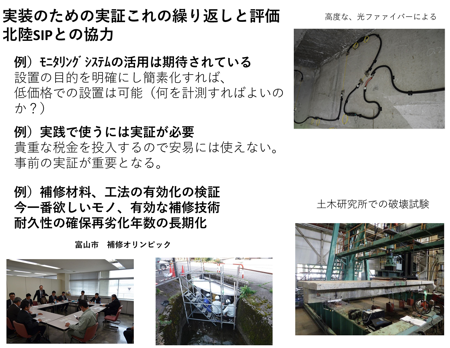 ということで、「補修オリンピック」と言う物を富山で実施している。これには、北陸地区の多くの大学の先生方に参加していただいている。富山市の管理する橋梁などのフィールドを使い、実際に試験施工をしていただき評価を実施している。これも、5年目になるので、そろそろ最低の耐久性が実地で確認できることになる。
