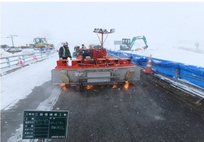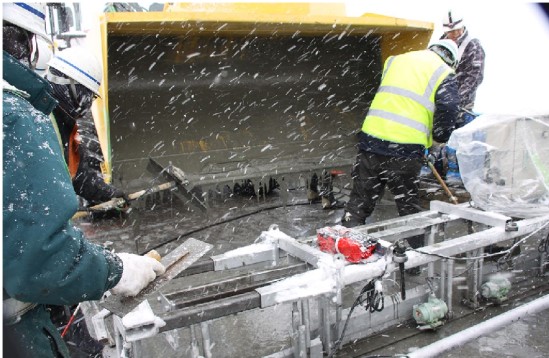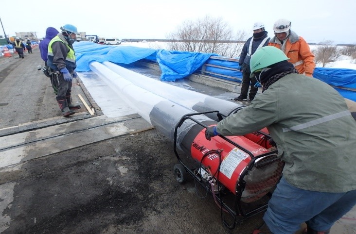 日本の寒冷地において、冬期の施工に関しては、特別な配慮がいる。なるべく冬季施工は避けたいところであるが、種々の事情によって、施工開始が冬季になることは稀ではない。現場打ち超高性能繊維補強コンクリートであるJ-テイフコムの冬季施工も数例あるので、ここで紹介したい。その一つは、北海道岩見沢の二股橋である(径間長2x30m、1972年架設)。ここでは、雪が散らつく中、雪を除去、舗装を切削した後、ウオータジェットで研掃し、ヒーターで床版上面を加熱した直後に、J-テイフコム20mmを施工した(図-11、図-12)。-7℃下の施工にあたっては、練り混ぜ水として、60℃の温水を使用した。施工後の養生にも注意を払い、一晩中、上面をブルーシートで囲った中、図-13右に見るようなジェットヒーターで温め続けた。こうした配慮によって、補修工事は順調に進み、工事の後、床版は徐々に乾燥状態を取り戻し、また、床版剛性も向上したことから、ひび割れの開きはほとんど無くなった。なお、本ジャーナル現場を巡る18/3/30にもレポートがあるので見ていただきたい。