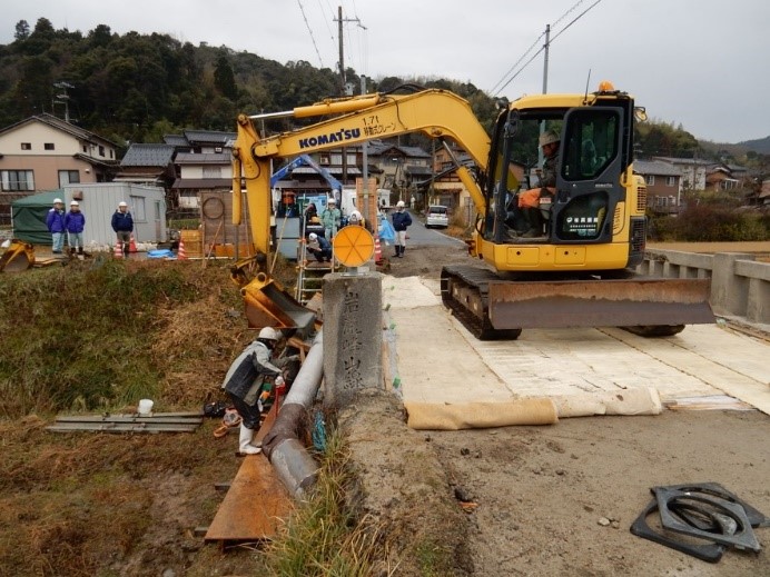 図-16 ユンボ(油圧ショベル)による主桁の補強と補強後