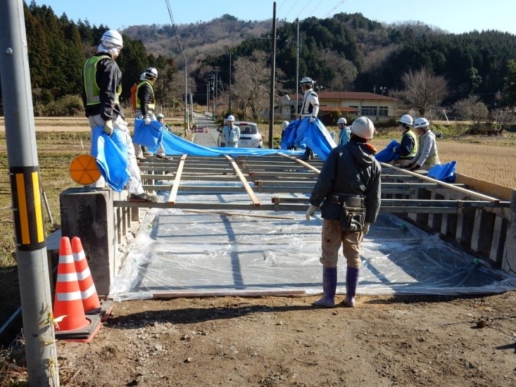 もう一つの冬季施工の事例は、京都府京丹後市に位置する単純RC桁橋、古川橋(橋長9.7m、昭和4年架設)の補修・補強工事である。古川橋の2019年1月の補強では、床版増厚に加えて、RC外桁の底部補強が追加されている。床版の増厚は20mm、RC外桁の増厚は40mmとした(図-15)。