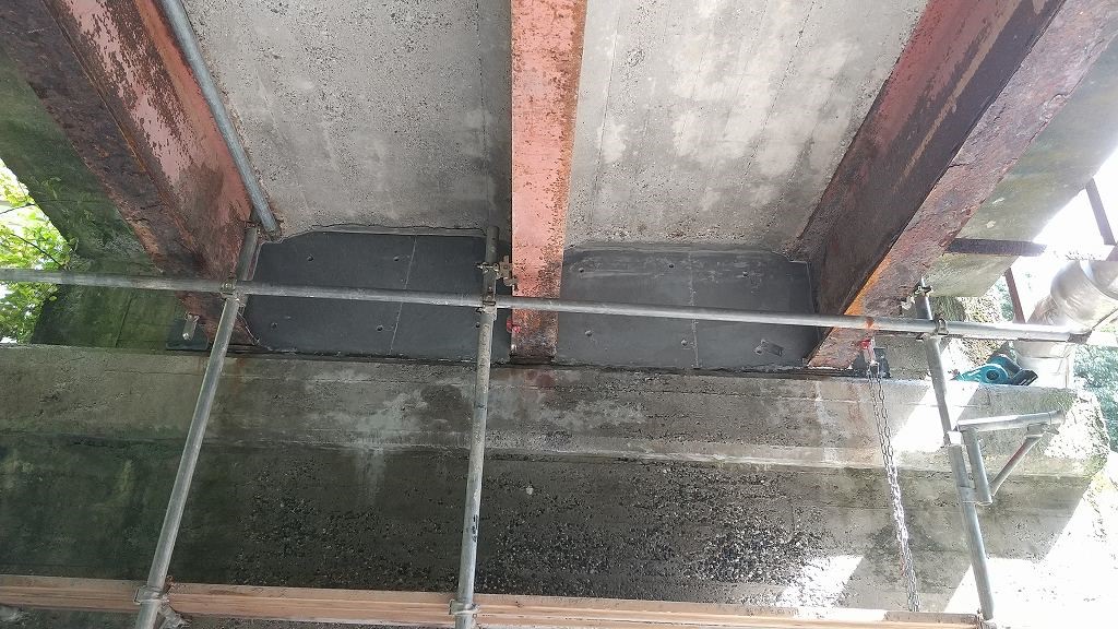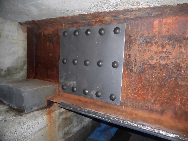 周囲はうっそうとした木立の中にあり、坂道である参道にあるため、冬季は滑り止めとして塩化物が散布される環境にあり、点検の結果、主要部材である鋼桁の腐食、両端部のコンクリート床版の劣化、それに片側支点部の支承板・端横桁が相当腐食していることが判明した。そこで対策として、鋼桁・鋼支承の塗装塗替え補修、鋼桁の当て板補強、コンクリート床版および片側橋梁端部のJ-テイフコムによる補強等を提案し、採択された。端横桁部の施工は、2022年8月、端横桁を型枠で覆った後、床版上面から2か所の穴を開け、そこからJ-テイフコム材を流し込んだ(図-19)。