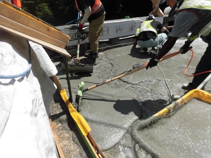 外桁へのJ-テイフコム施工は、橋の側部から斜めに配置した流し込み板と油圧ショベルを用いて行った。チクソトロピー性に優れたJ-テイフコムは、片面から流し込んだ材料が、内側の主桁側面に到達し、外側と同じ高さとなる。この施工状況および施工後の様子を図-16に示す。
