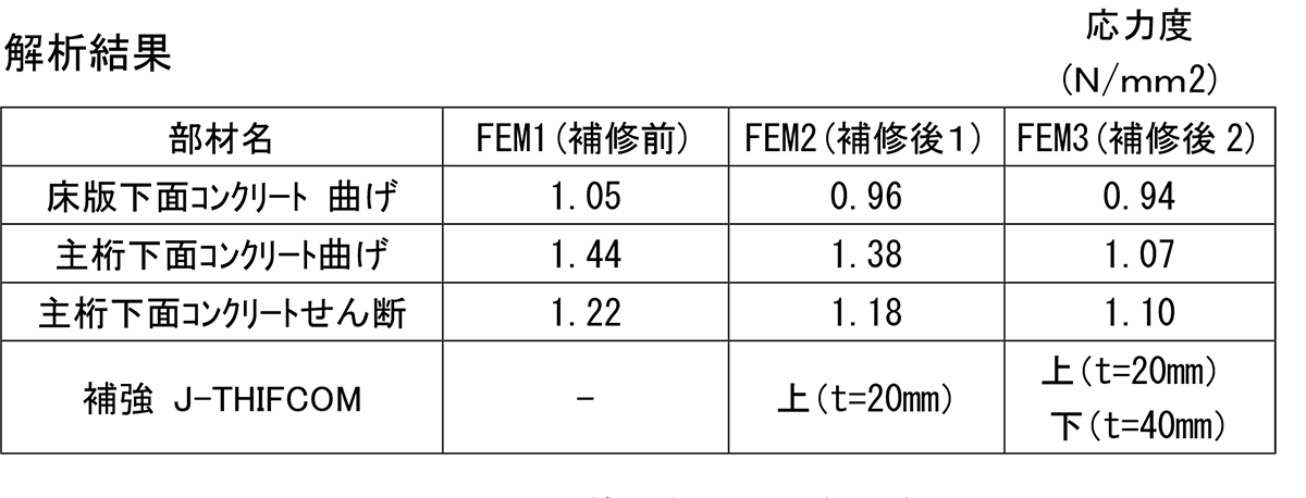 本橋の施工でも、気温0℃下の日中作業の後、夜は-5℃まで気温が下がることから、二股橋に似た熱養生が実施された(図-17)。本橋では、J-テイフコムによる補修効果が、どれほどになるかを調べるために、FEM解析を行っている。補修前(FM1)と補修後(FM3)を比較してみると、補修後の床版コンクリート応力は、ひび割れが生じる引張応力度 1.00 N/mm2 を下回っており、一応の補強効果が期待できる。一方、主桁下面の引張応力は、26%低減され、顕著な補強効果が得られる(図-18)。これは、引張特性を有するテイフコムが鉄筋補強に似た効果を持つことによるものであり、さらにせん断耐力も高まるメリットが期待できる。さらに、J-テイフコムの引張抵抗は、9 N/mm2(マニュアル設計基準値)なので、ひび割れは発生しない