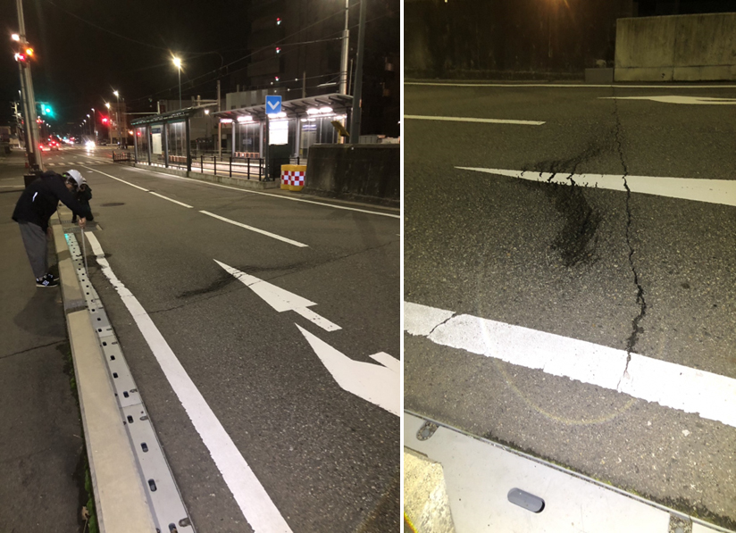 もう一つ実証できたのは10年前に、ゲルバー構造のRC橋を架け替えた。その時に、部下とも話し合い、ポータルラーメン橋にした。理由は今後の維持管理社会を鑑みて、弱点になりえる、「支承と伸縮装置の無い構造」と言うことを考えた。さらに、当時の副市長との雑談の中で、「水害や地震の時に、橋梁の前後の段差が、なるべく起きない構造は? どうすればよいか?」と言われ、「とりあえずは“踏みかけ版“の設置ですかね」と言うことを答えこの橋梁には設置した。液状化の予想される地域であるということもあり、自視したが、下の写真のように、損害は非常に軽微である。これらの有効性が実証できたと考えている。