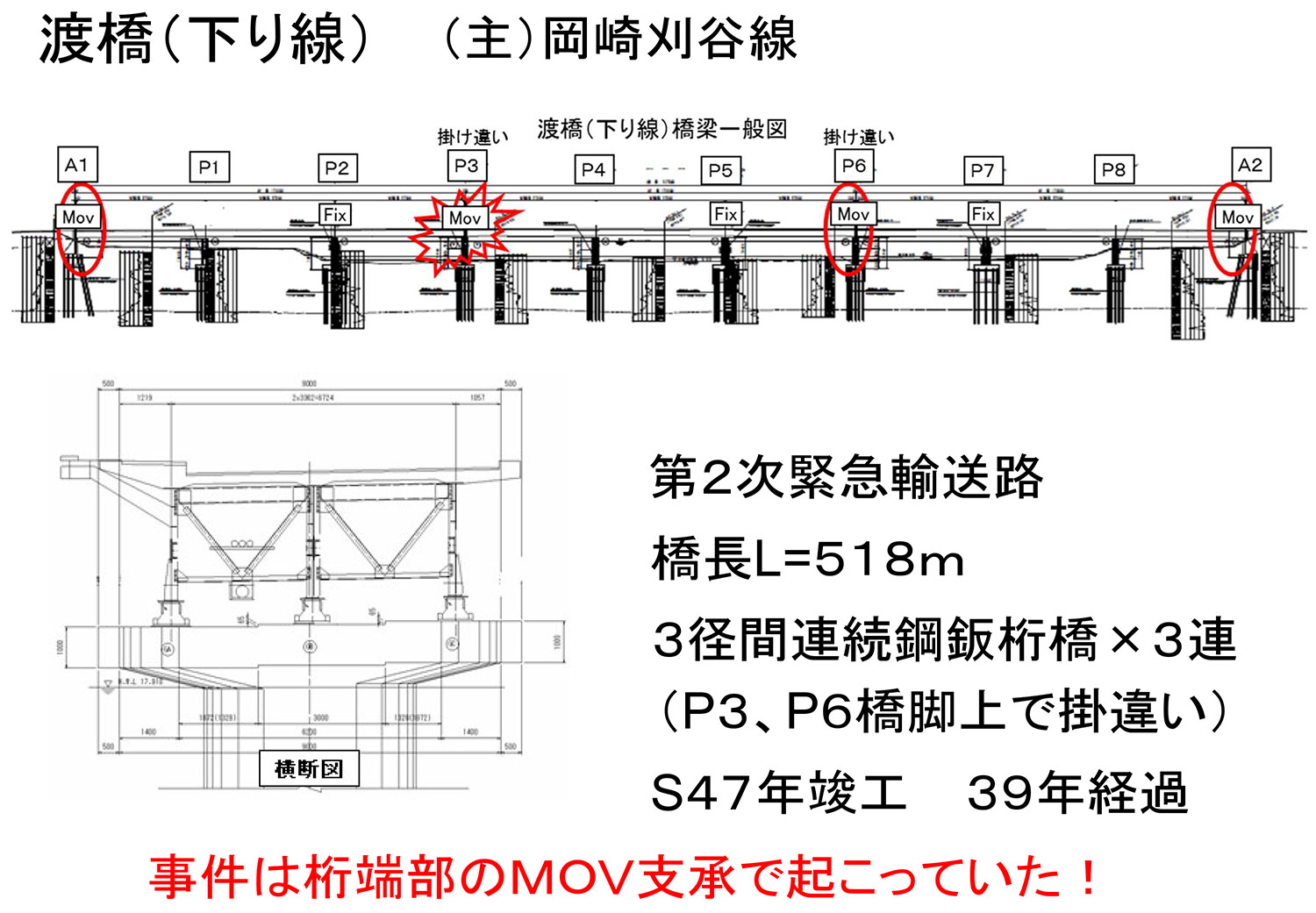 P3橋脚上の損傷が最もひどく、4本のローラーの内、外側の2本が逸脱し、残り2本も外側にせり出してわずかに引っかかっているだけという、供用中の路面上に段差が生じる一歩手前の非常に危険な状態であった。