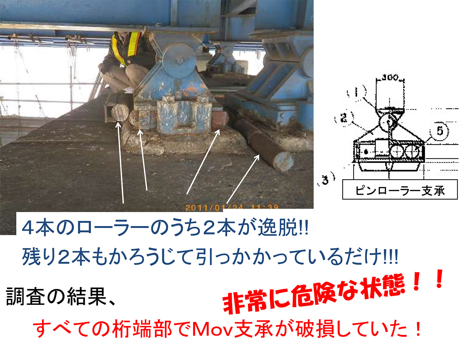 2011年(平成23年)1月、落橋防止システム工事のために足場を設置したところ、「桁端部のMov(ピンローラー)支承のカバーが変形している」と施工業者から報告があった。カバーを取ったところ、ローラーが逸脱していた。橋梁全体を調査すると桁端部のすべての支承のローラーが逸脱もしくはせり出し壊れていた。一方、桁端部以外の中間支点部のカバーが設置されていないピンローラー支承、固定支承はすべて健全であった。