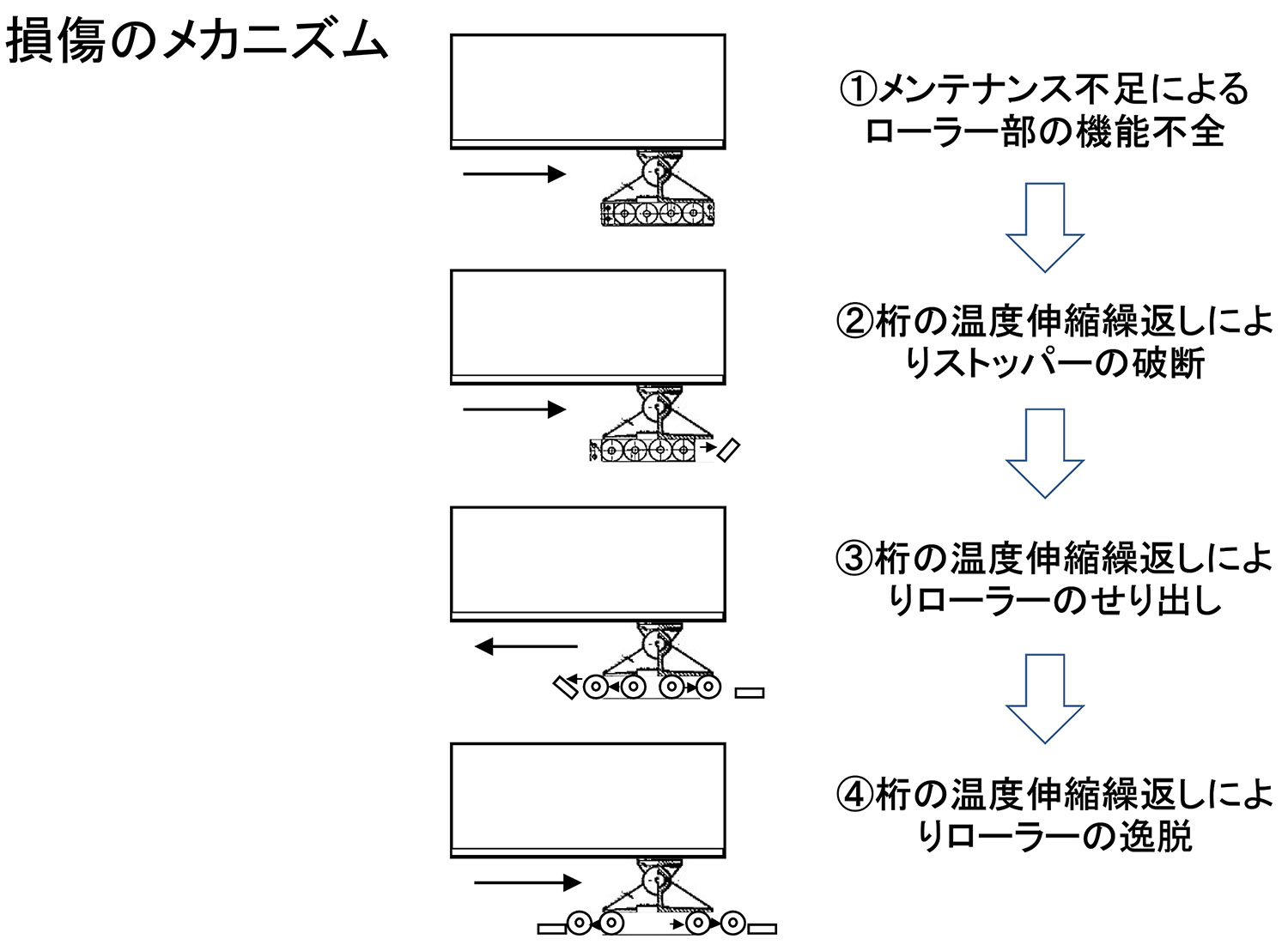 損傷の原因は、ジョイントからの水や土砂等の侵入を防ぐ目的で設置された支承カバーがかえってメンテナンスを困難にし、さらに鳥の営巣⁉などによる異物混入のため、ローラー部が機能不全を起こし、桁の温度伸縮等の繰返しにより、徐々にせり出し、ストッパーを破断させ、逸脱したと推察された。