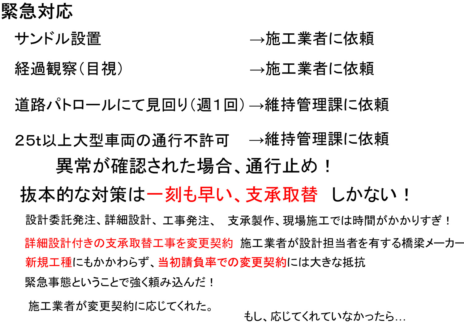 これらはあくまでも応急措置であり、抜本的な対策としては「一刻も早く壊れた支承を取り替える」しかない。