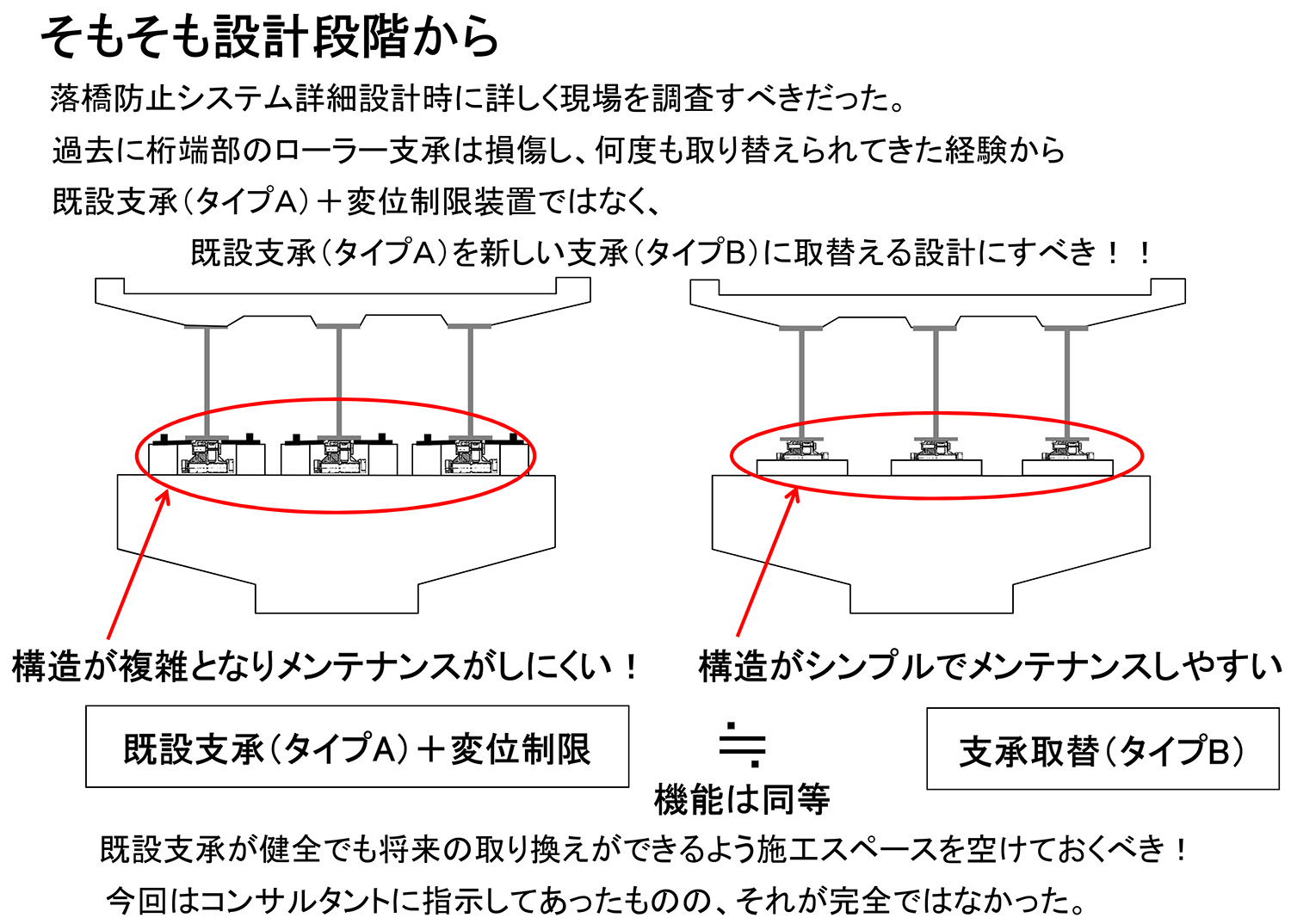 そもそも設計の段階から落橋防止システムの設計時にもっと詳しく現場を調査すべきだった。また、過去に桁端部のローラー支承を何度も取り替えてきた経験から、既設支承の周りに変位制限装置を設置するのではなく、既設支承を新しい耐震基準の支承に取替える設計にすべきだった。