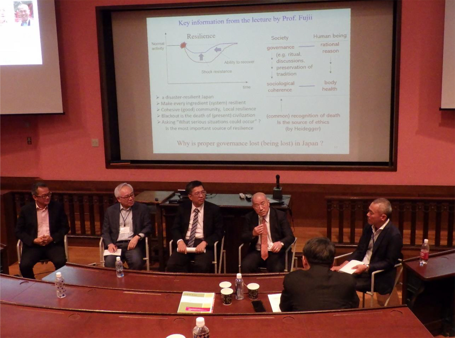 これまでのSSMSに多大なご尽力をされた、台湾の陳 振川(Jenn-Chuan Chern)教授を、パネルディスカッションの特別ゲストにお招きして、私が司会をする形で、社会のレジリエンスやサステイナビリティについて議論しました(写真3)。その中で、陳教授が言及された教育の本質を以下に紹介します。ちなみに、陳先生は、台湾大学土木工学科のコンクリートを専門とする教授を務められ(現在は名誉教授)、台湾コンクリート学会の初代会長や台湾土木学会に相当する中国土木水利工程学会長などの要職を歴任され、2008年から内閣の公共建設副大臣を兼務、2012年からは公共建設大臣に相当する大臣職で入閣し、2009年8月に発生した699名の死亡・行方不明者を出したモラコット台風の大災害からの復興の陣頭指揮を執った方です1)。陳先生は、2011年からSSMSの学会長も務められ、岡村甫先生を始め、多くの日本人の先生方も信頼・信奉する誠実な学者であり実務者であります。