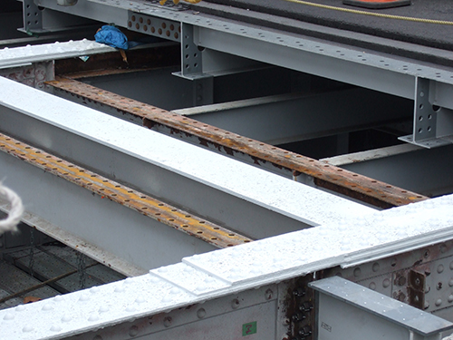 鋼床版の架設に当たって一番難しかったのは接合部の取り合い。新設橋であれば工場で予め桁と孔明け位置を合わせた上で添設してもほとんど支障は無いが、既設橋では図面と微妙に異なることが多く、床版に予め添設孔を設けず現場で位置を照らし合わせながら、孔を明けることで解決している。また、長期耐久性を確保するため添接部近傍については1種ケレンを施した上で弱溶剤系のポリウレタン樹脂下・中塗り、ふっ素樹脂トップコートによる重防食塗装を施している。