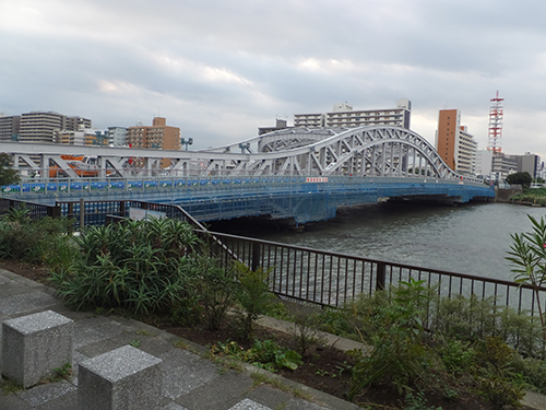 白鬚橋は昭和3年9月に着工され、昭和6年6月に竣工した橋長169.8㍍、幅員22.8㍍の鋼ブレースドリブタイドアーチ(中央径間部)+ポニートラス(即径間部)橋。明治通り上の隅田川渡河部(東京都墨田区堤通り~荒川区南千住)に架かる橋梁だ。関東大震災での被災は免れたが、当時の橋梁が木橋であったことや老朽化していたことから、民間が賃橋として運営していた権利を当時の東京府が買い取り、都市計画事業として新たに建設したもの。建設時の設計は増田淳(増田橋梁事務所)、下部工は大林組、桁製作は川崎造船所、桁架設は宮地鉄工所(現宮地エンジニアリング)が担当した。白鬚橋の名前は近くにある白鬚神社に由来する。塗装色は優美な白色である。