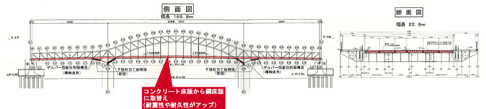 今回の長寿命化対策は現状のグレーチング床版を12㍉厚のバルブリブ型鋼床版に取り替えるもの。元々建設当初はRC床版だったものを昭和46年にグレーチング床版に打ち替えており、今回の取替えは43年ぶりとなる。