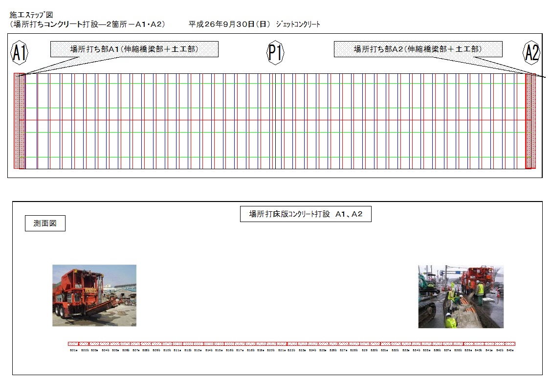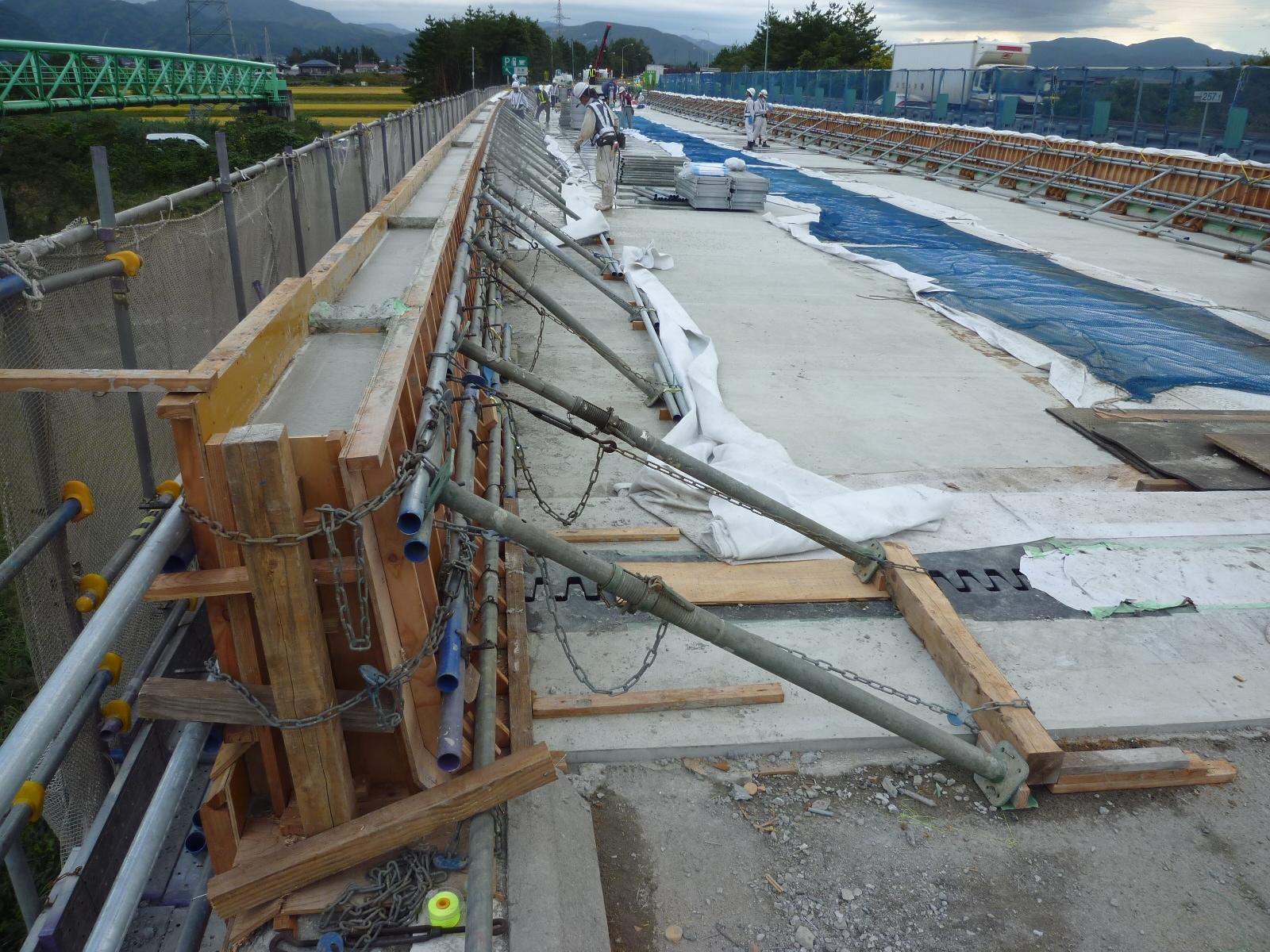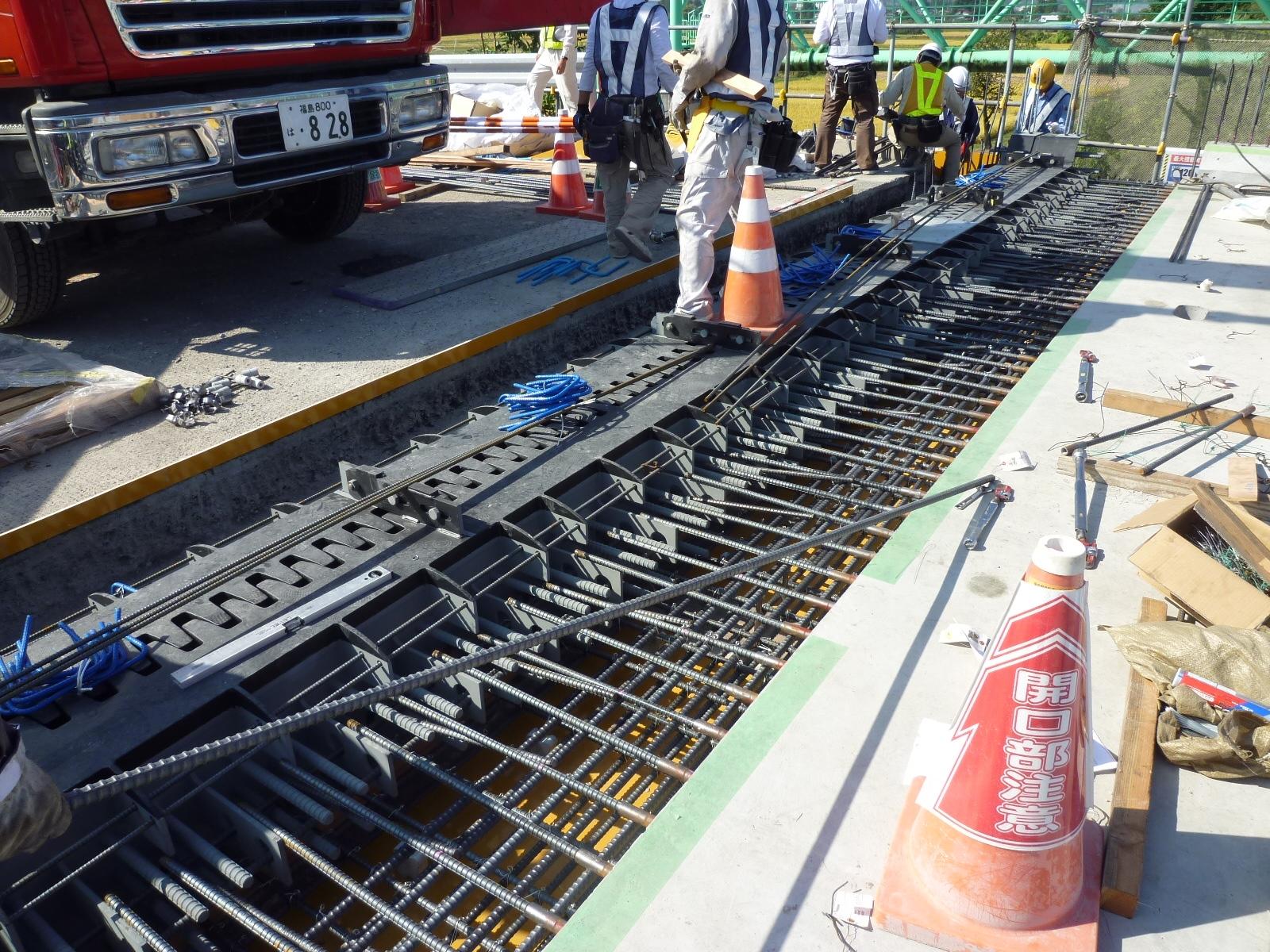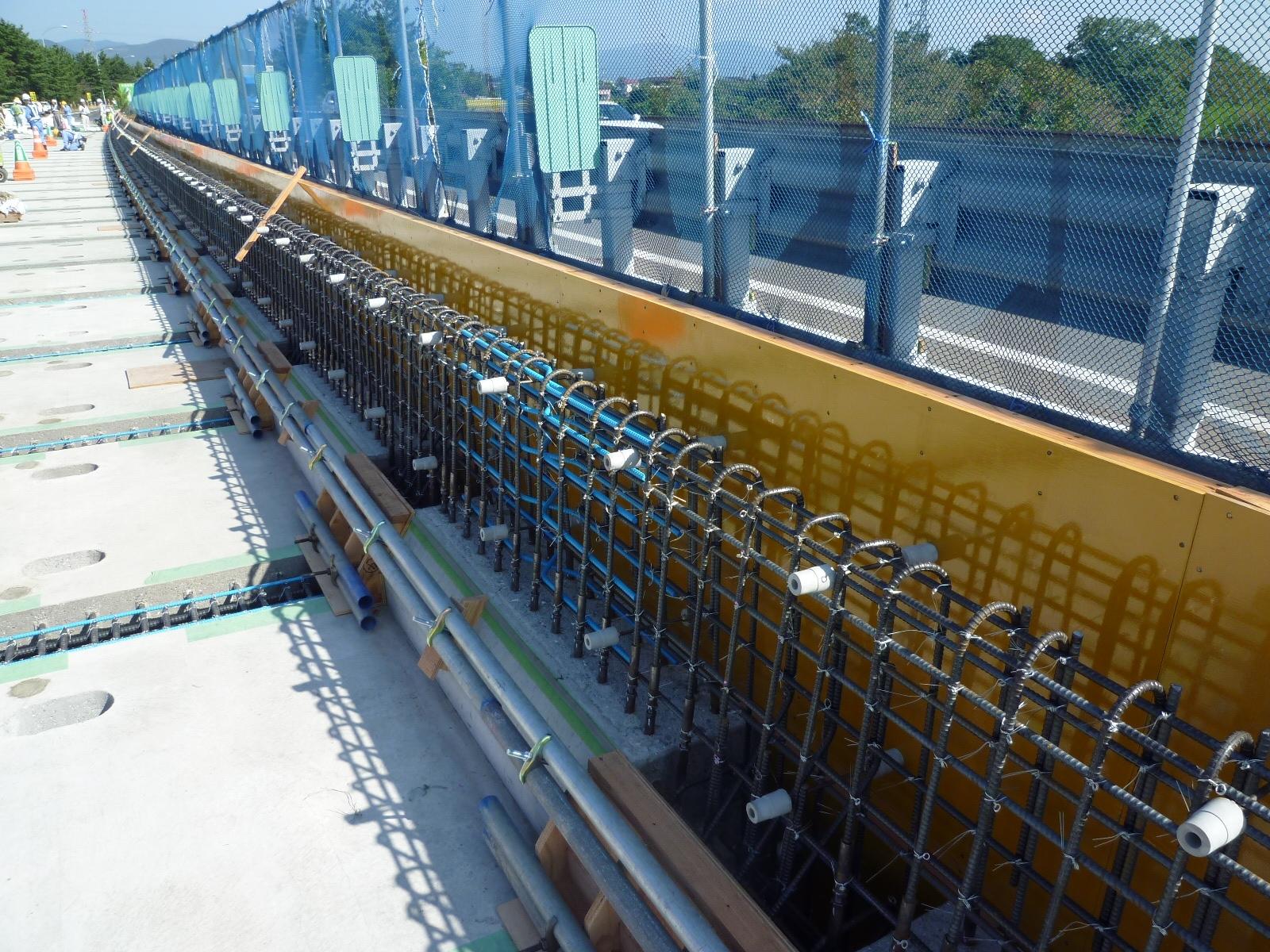 その後壁高欄を打設するが、間詰め部と同様50Nの早強コンクリートを使い、一部凍結防止剤の影響が出やすい個所にエポキシ樹脂塗装鉄筋を採用している。そして最後に伸縮装置を交換、同様に間詰め部(床版隣接部は1,000㍉、土工隣接部は500㍉)を施工した。