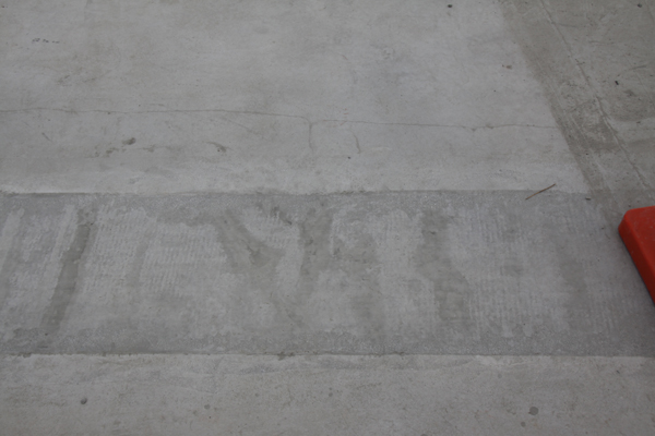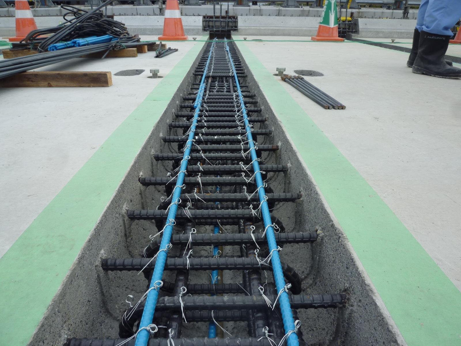 次に継手部の間詰めコンクリートを打設した。打設箇所は42個所あり、1カ所当たりの打設幅は平均350㍉ある。これに対して現場では50Nの膨張剤入り早強コンクリートで打設している。なお、桁へのノロを防止しつつ型枠工を省略するため床版下面の繋ぎ目にはポリウレタンフォーム製のシール材(「トメルンダー」)を採用し、作業を効率化している。また、プレキャストPC床版同様に地覆の高さ16㌢までを一体化した構造になるよう型枠を設置した上で打設し、床版と地覆の間の目地をなくしている。間詰め部最外縁の鉄筋は凍結防止剤の散布による劣化を防止するためエポキシ樹脂塗装鉄筋を採用している。