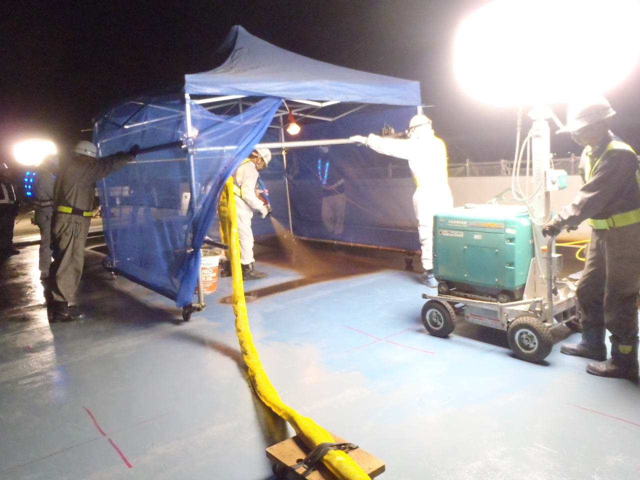 床版防水工の施工(左)遠景、(右)約800平方㍍を一日で施工