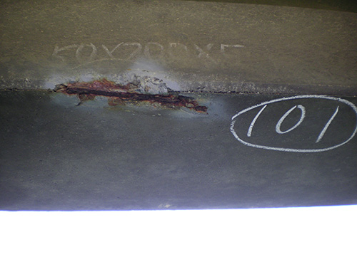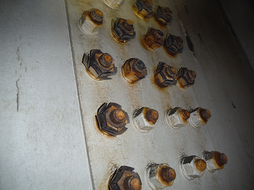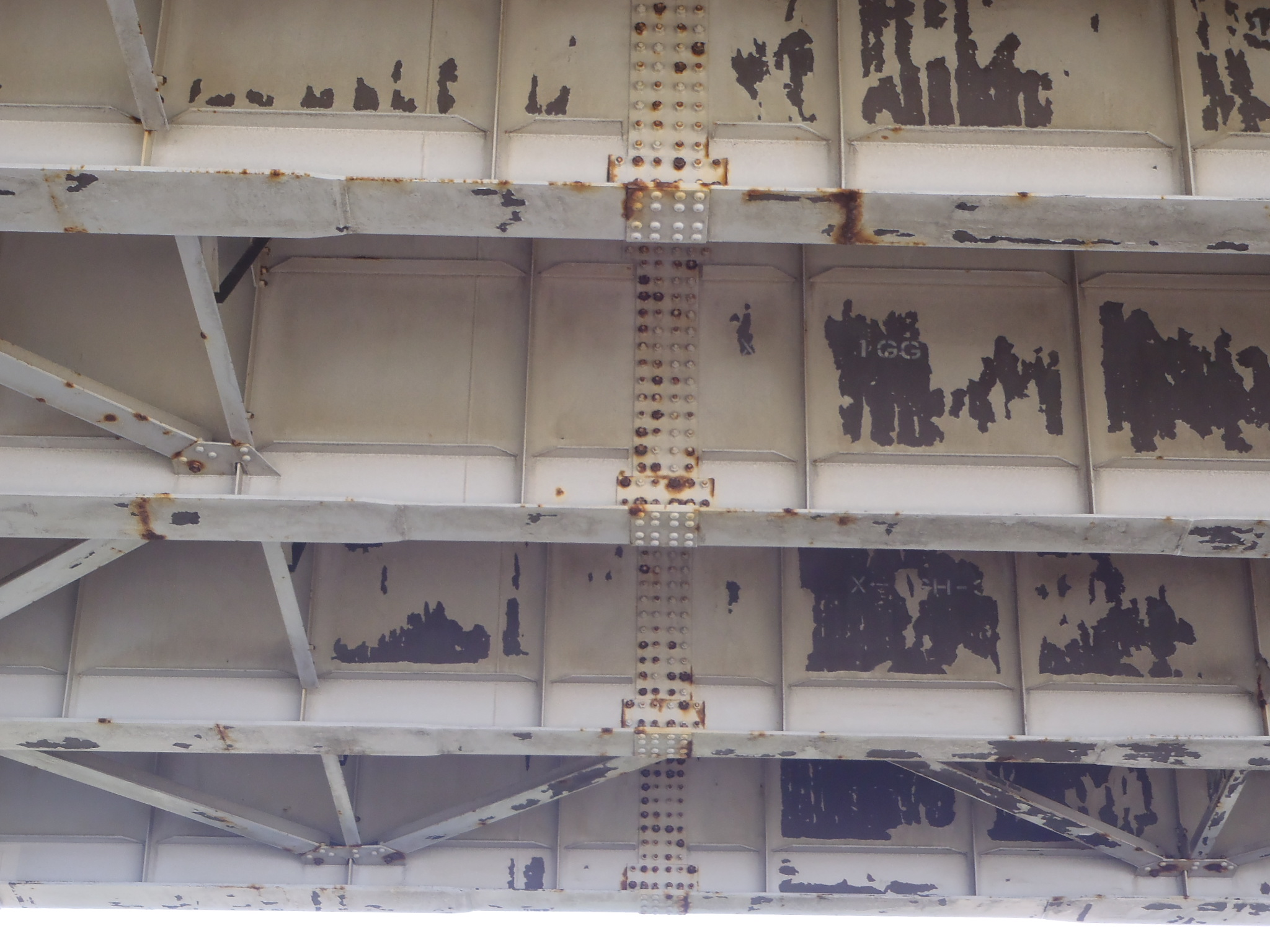 既存の防食はふっ素樹脂系の重防食塗装が施されていたが、施工から30年が経過し、塗膜の劣化や腐食の発生が生じていた。特に添接部においては劣化が著しく進んでいた。一方、塗膜は鉛を微量(塗膜1㌔当たり30㌘)ながら含んでおり、施工時の安全性を考慮する必要がある。コンクリート桁部も部分的に塩害などの影響から剥落や鉄筋露出が生じており、断面修復等を行う必要があった。