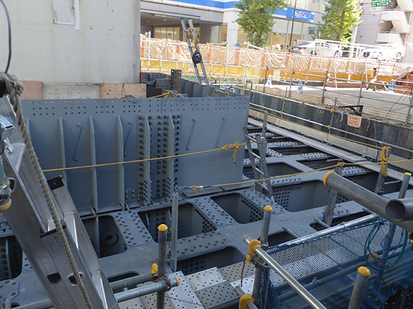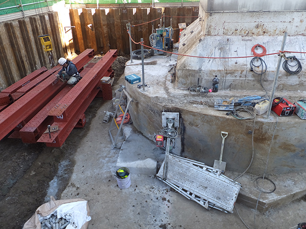 新設フーチングは工場製作の鋼製格子部材を用いたSRC構造で、既設フーチングとの境界面は目荒らしにより付着強度の向上を図るとともに、既設の鉄筋をはつりだして新設側の鉄筋と溶接で繋いで一体化している。
