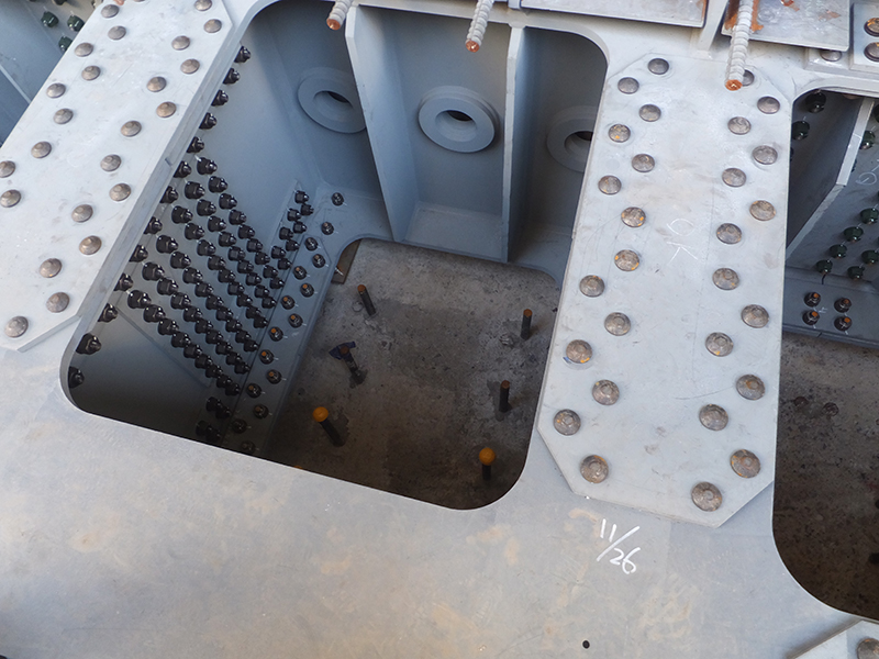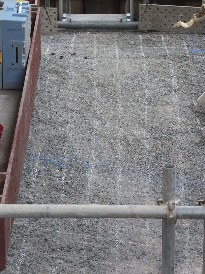 また、同構造はアンカーボルトを省略しているため、浮き上がり防止策として格子部材にひっかける形で逆U字型の拘束筋を配置。拘束筋は既設フーチングに1㍍程度差し込むことで一体化させた。差筋の事前作業として既設フーチング内をRCレーダーで精密に探査した上で、コアで抜き、極力既設鉄筋を傷つけないように配慮している。