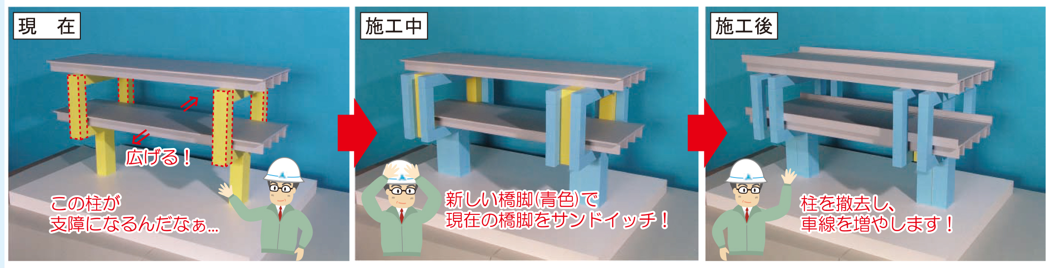 ダブルデッキを上下層とも拡幅、サンドイッチ工法を採用