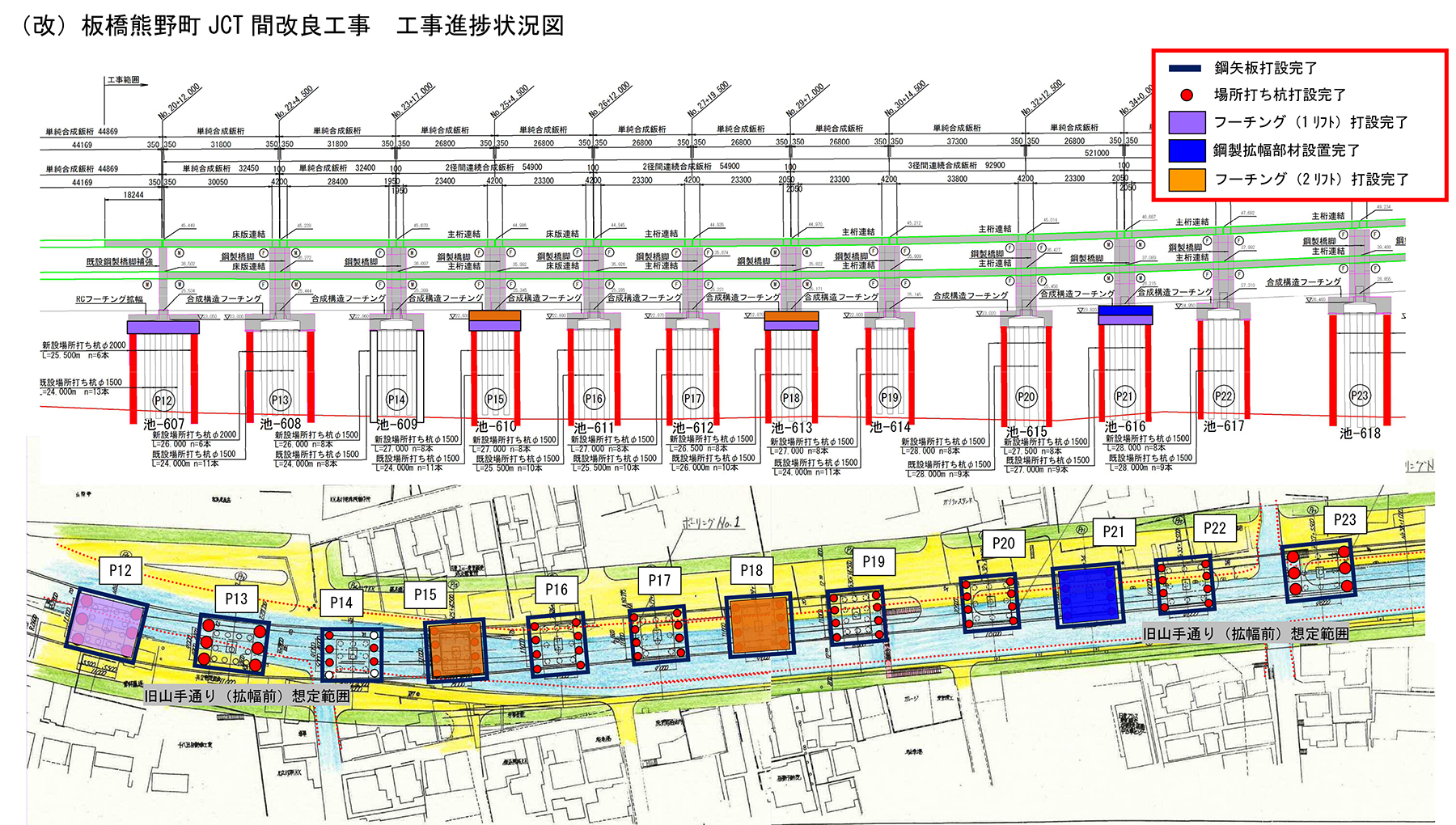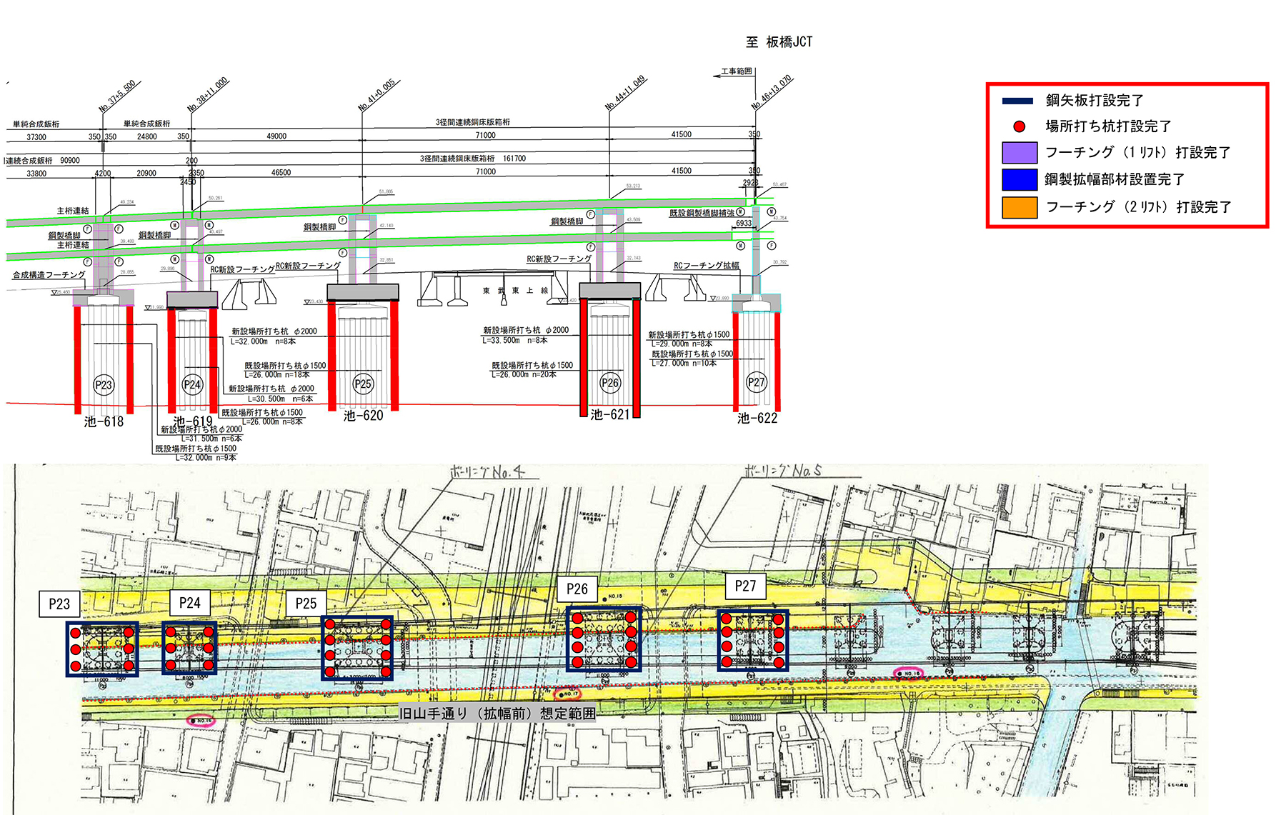 また、P12及びP27は既設鋼製橋脚を補強し、RCフーチングを拡幅し、P13~P23 のようなサンドイッチ工法を使わない。P24~P26は土被りが十分あるため、既設のフーチングの上に従来通りアンカーフレーム方式によりRCの新設フーチングを施工する。また、同箇所はラケット式橋脚を一体化しない。