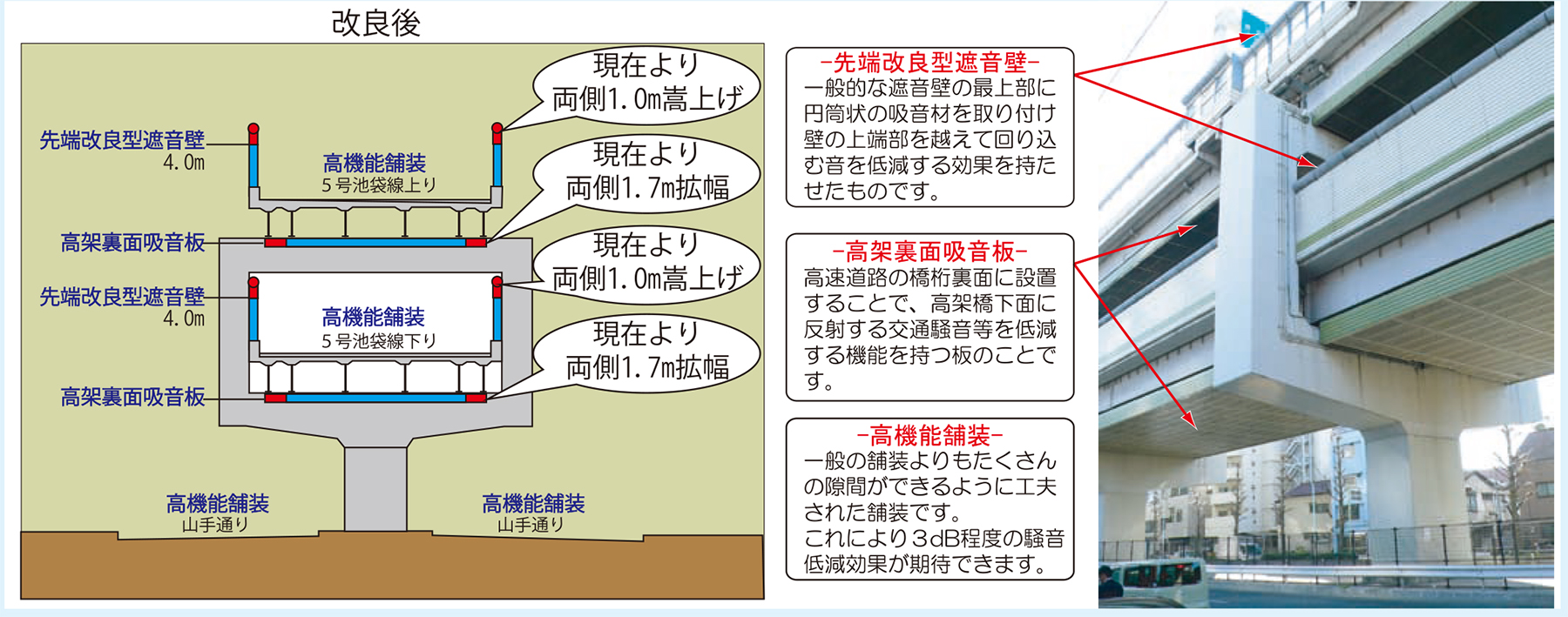 遮音壁を既設よりも1㍍程度かさ上げするとともに、拡幅部にも裏面吸音板を施工する。高欄部の剥落防止工も施工する。