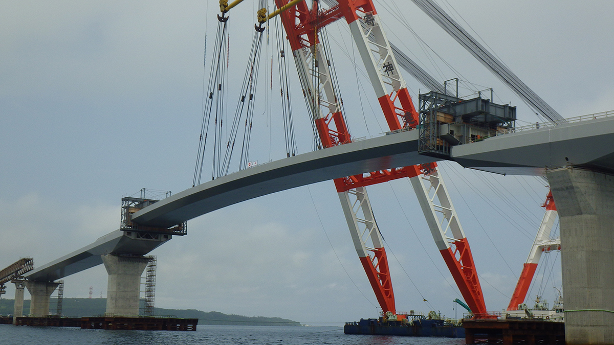 作業手順は、4000トン級フローティングクレーンにより、まず宮古島側の側径間を架けた後、伊良部側の側径間をセットバックした位置に架ける。最後に中央径間を架設し、伊良部島側の側径間をセットフォーすることで所定の精度を確保する。その後に内部からボルトで仮留めし、足場を使って外側から全断面溶接を行い連結する。