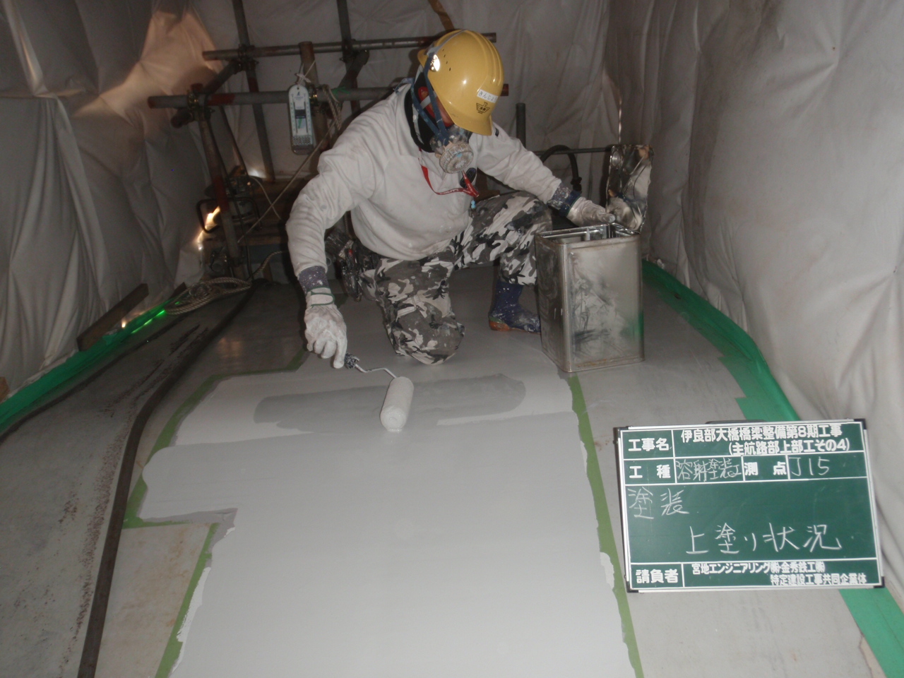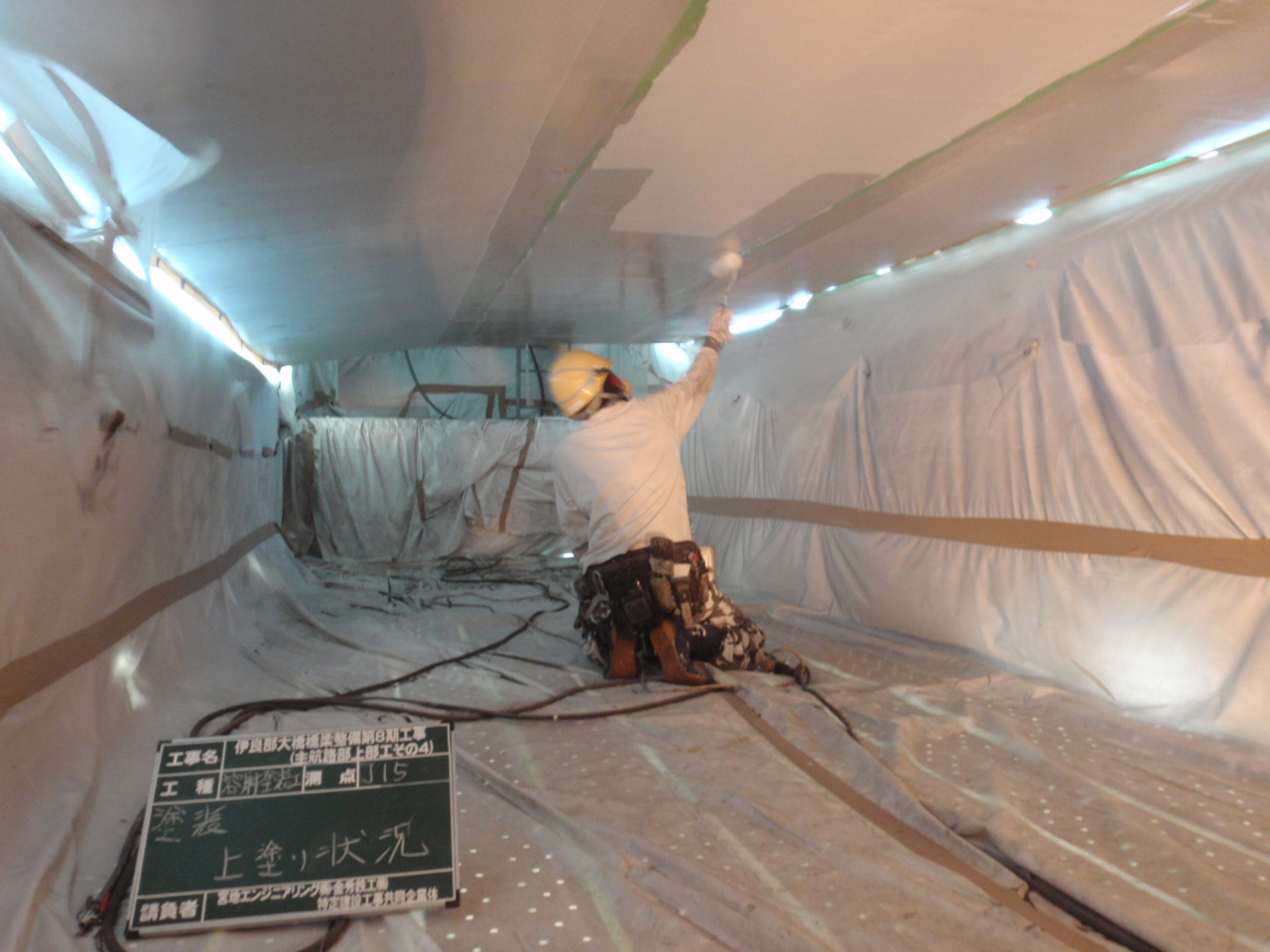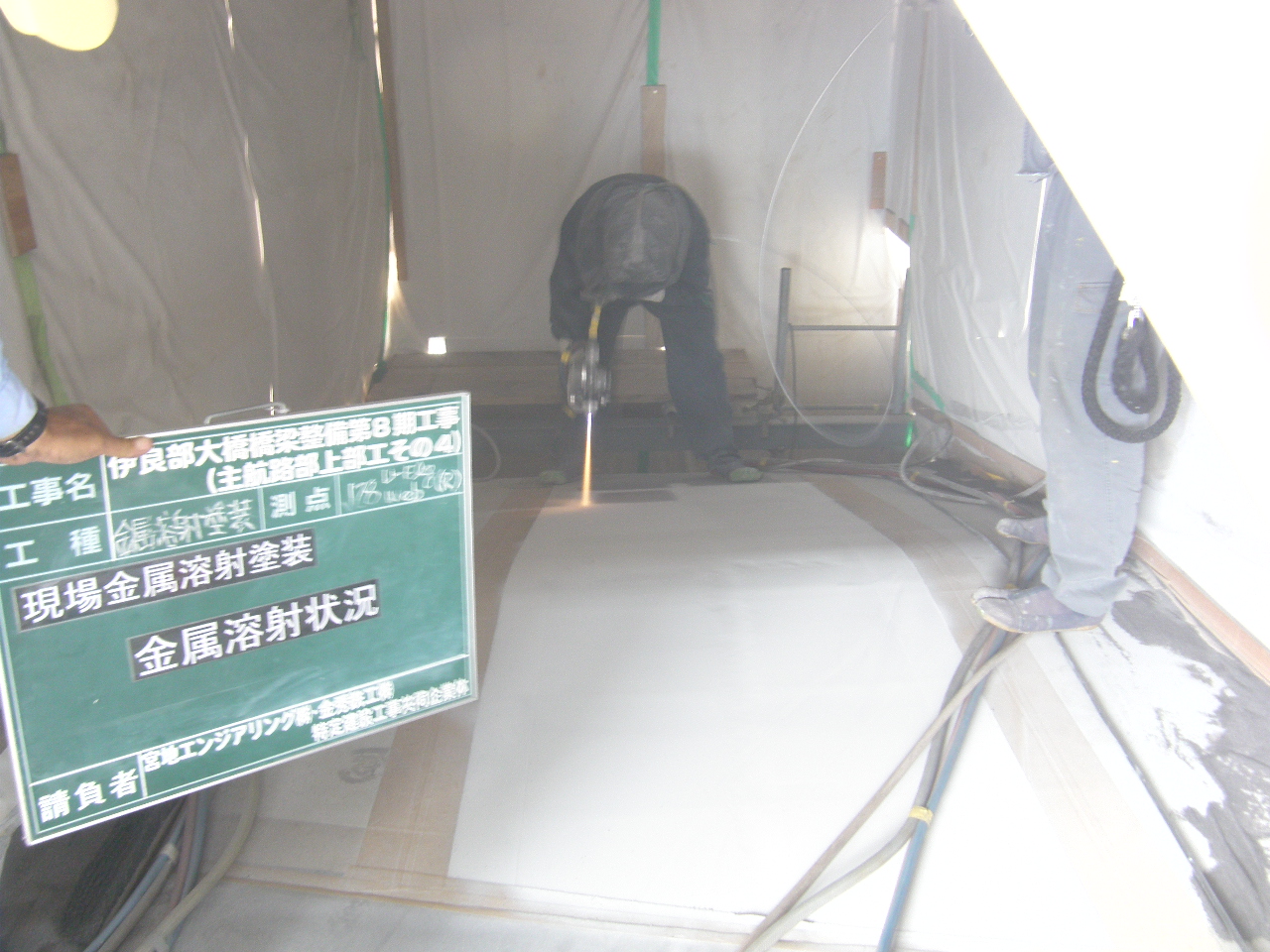 その上で長期耐久性が最も期待できる防食下地として、金属溶射(Al・Mg溶射)が選定され、さらに防食下地の上にC5系塗装(ふっ素仕様)を適用した。なお、この防食仕様は桁外面部に適用され、弱点となる全断面溶接部の溶射膜厚は一般部より50μ厚くしている。素地調整も従来のSa2.5ではなく、最も厳しいSa3.0としている。