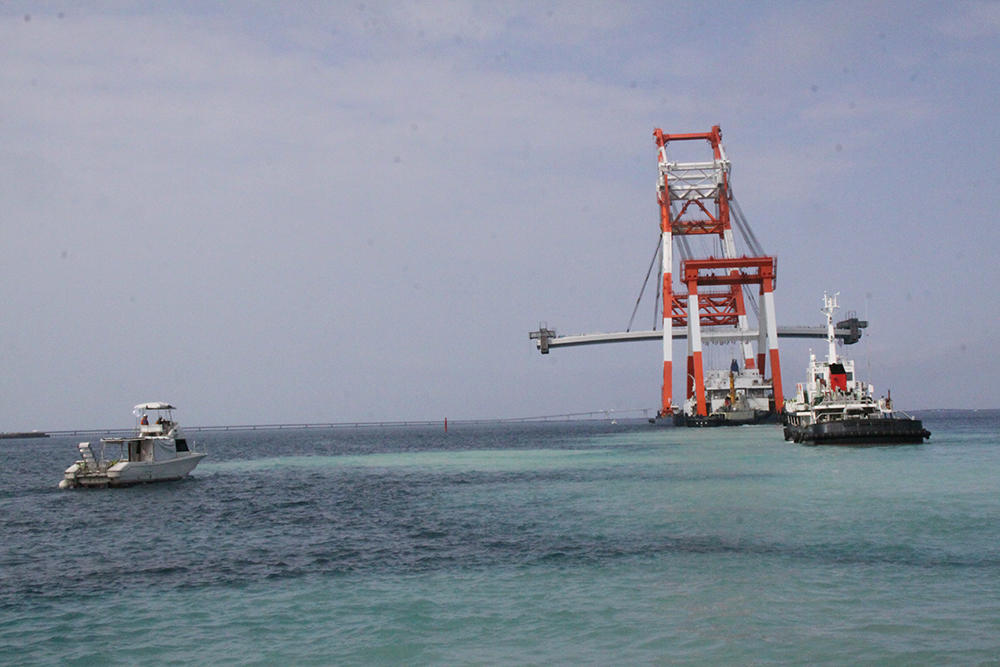 そのため、大ブロックの運搬・架設は、冬季波浪と台風シーズンの合間になる3~5月を中心とした最も静穏な時期を狙って、外洋架設用の4000㌧吊FC船「洋翔」を用いて施工した。2012年度に架設予定であり、両側ブロック(120㍍×2)は同年度に架設していたが、中央部のみ風速・波高・潮流が揃わなかったことから1年延期し、2013年4月16日に無事架設した。