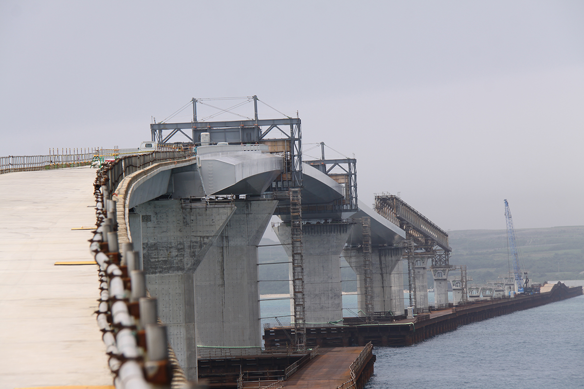 桁連結施工時の足場高さは海面から33㍍あり、風の影響を非常に受ける。