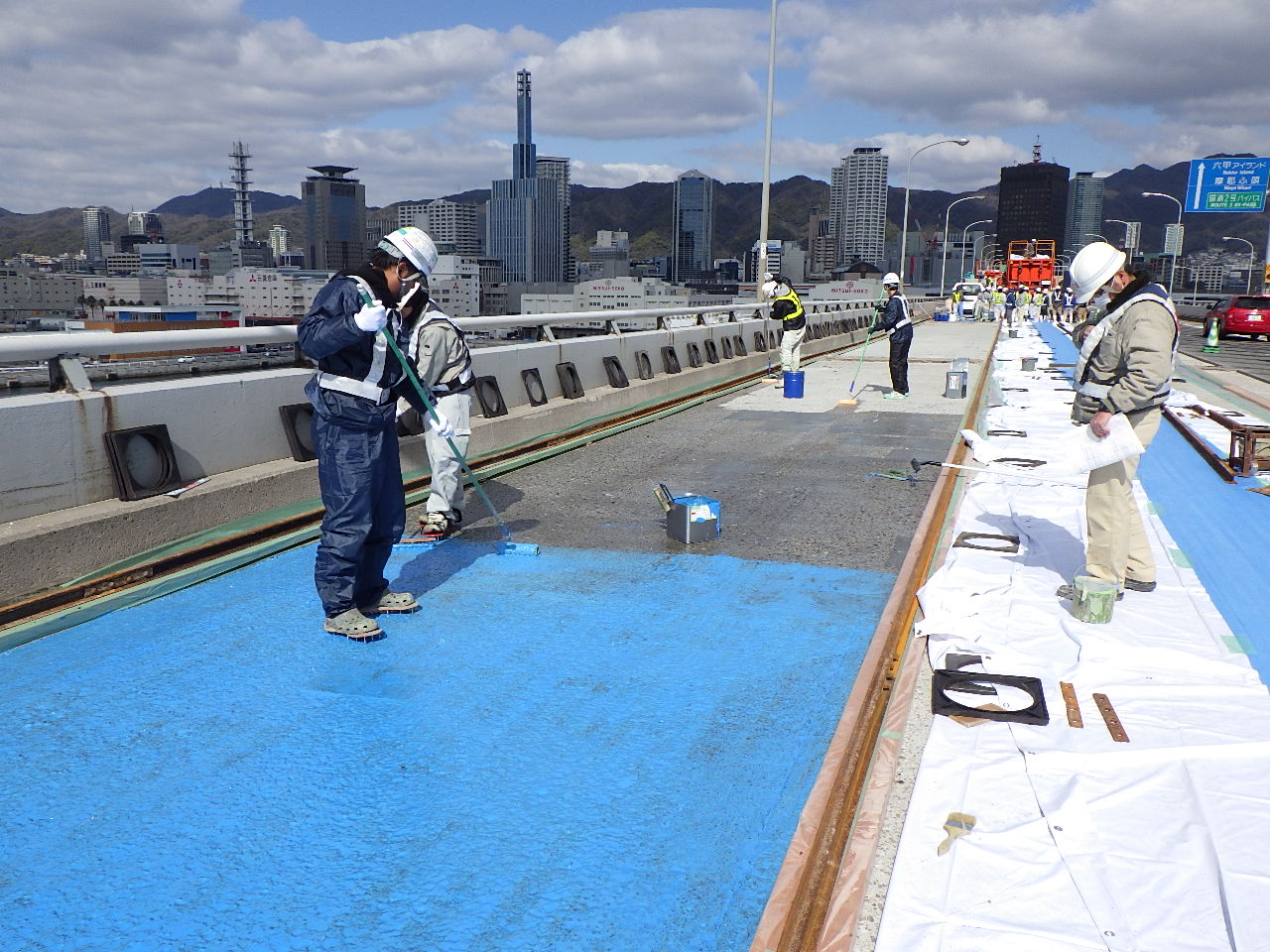 神戸市みなと総局は、神戸大橋の本土側取り付け部上り線(神戸市中央区新港町4(第4突堤部)の単純鋼I桁2連(29.5㍍×2、幅員22㍍)のRC床版に対し、超速硬鋼繊維補強コンクリート(以降、SFRC)上面増厚による補強を行った。供用後45年が経過しており、大型車交通量も多く、床版厚も現行規定より薄いことから、ひび割れによる損傷が発生している可能性を考慮し、ひび割れに含浸・浸透するエポキシ樹脂系の浸透性プライマーを前面に塗布する仕様を採用した。同プライマーの適用は関西圏初であり、増厚工法の中での全面塗布仕様は全国でも初めて。