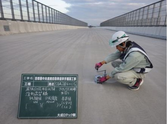 事前調査では、床版面の状態を確認し、引張接着強度(写真-1)およびサンドパッチング法(写真-2)によるキメ深さの測定を行った。なお、施工初期の平成26年10月に被膜養生剤の影響と推定される防水材(床版用接着材を含む)の剥がれが発生したため、引張接着試験に関しては、図-3に示すとおり1橋梁あたりの実施個所数を当初の5箇所から8箇所に増やし、かつディスクサンダー研磨の有無による引張接着強度の差を確認することにした。