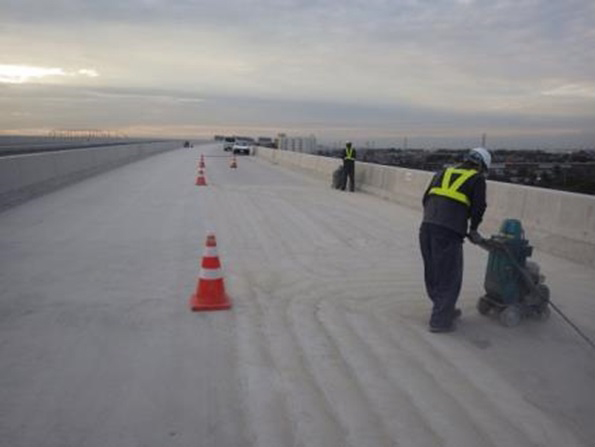 事前処理では、局部的な凹凸(コンクリートのジャンカや段差など)の補修を行い、事前調査の引張強度試験の結果により必要となった箇所について機械研磨を実施した。機械研磨による下地処理状況を写真-3、研磨後の表面状態を写真-4に示す。機械研磨の実施後、引張接着試験を行った結果、引張接着強度の平均値は4.0N/㎜2、最小値は1.6 N/㎜2とNEXCO規格1.2N/㎜2以上を満足していることを確認した。
