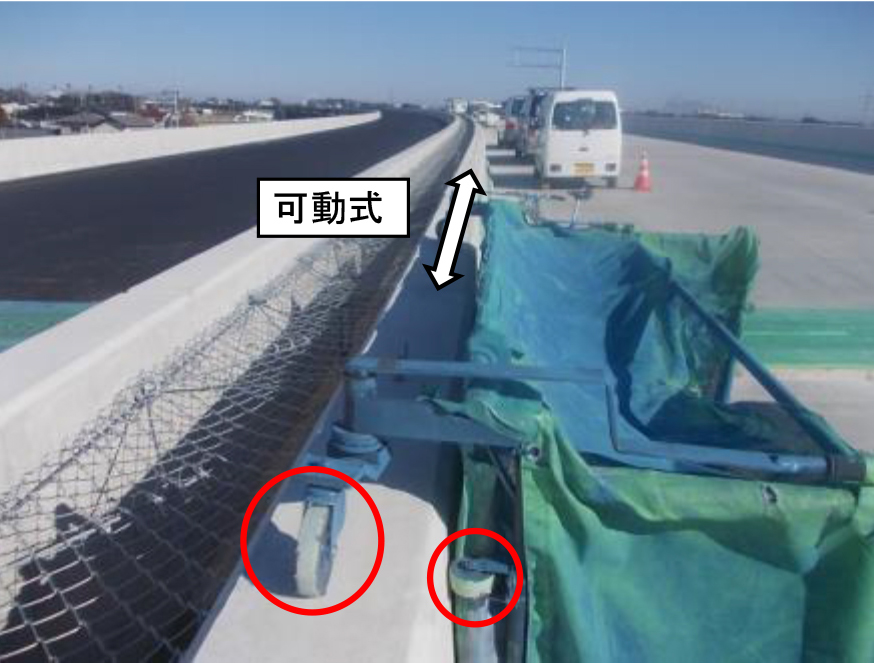 床版用接着材および防水材を散布方式で施工する際は、材料の飛散が避けられない。したがって、従来は高欄部分をすべてマスカー(幅広ビニール+ガムテープ)などで汚れないようにすべて養生していた。当該工事では、地覆部を施工する際の材料飛散を抑制するため、以下に示す特徴を持つ「可動式養生カゴ」を製作した(写真-5)。この導入により施工能力が大幅に改善した。