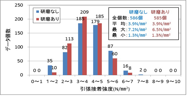 引張接着強度について任意で抽出して分析した結果を図-4に示す。引張接着強度の平均値はディスクサンダーによる研磨の有無に関わらず3.9N/平方㍉であり、NEXCOの規格1.2N/平方㍉以上を大きく上回っていた。ただし、引張接着強度が規格値に近い1 ~2 N/平方㍉となるデータ個数は、研磨なし(35件)が研磨あり(10件)の3倍以上であった。