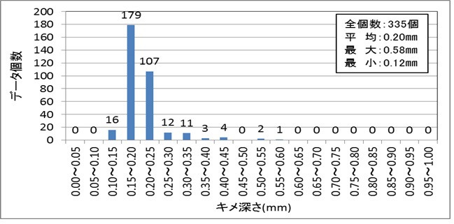 キメ深さについて任意で抽出して分析した結果を図-5に示す。キメ深さは、平均で0.2㍉、最大で0.58㍉であり、NEXCOの規格1㍉以下を満足していた。
