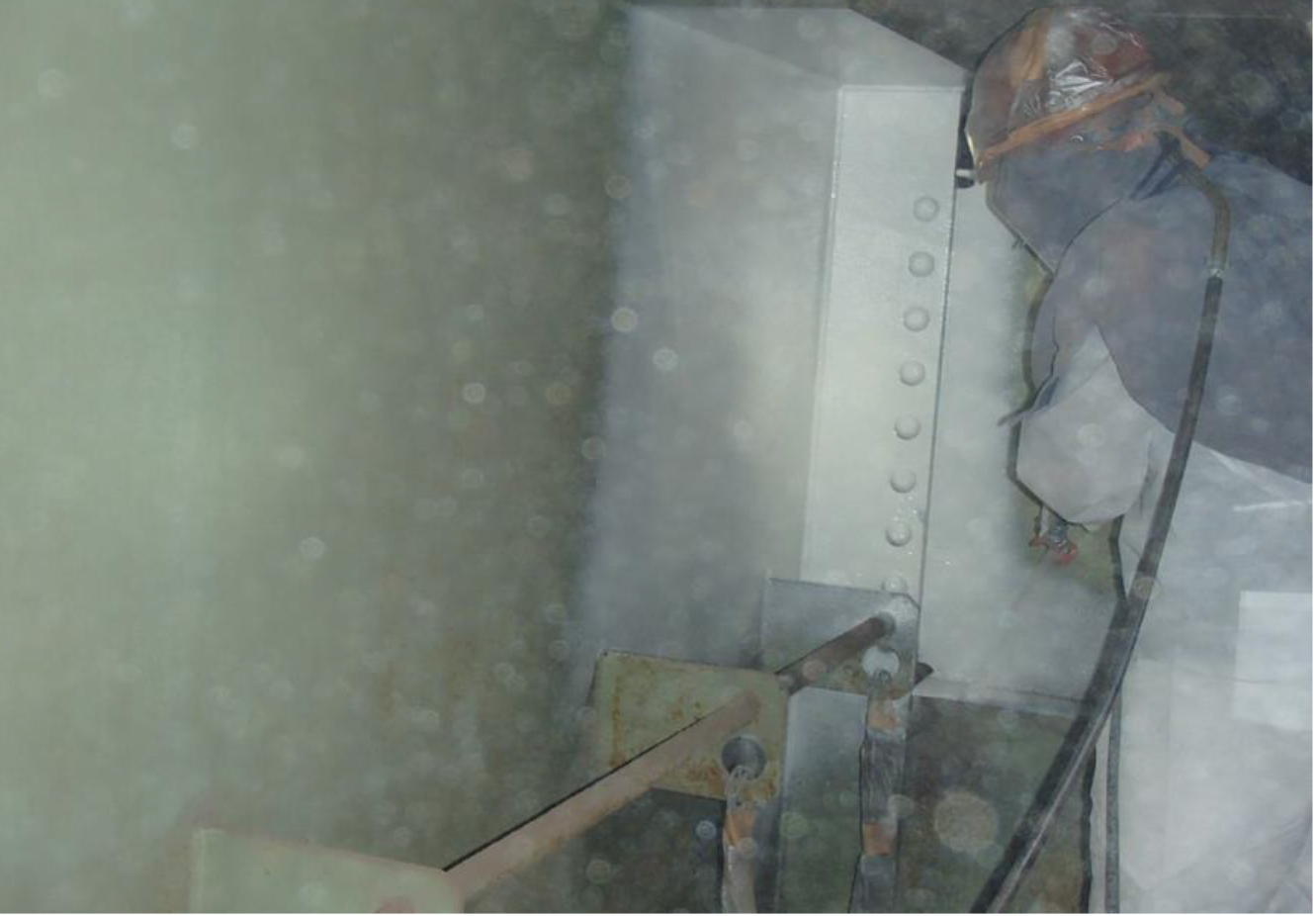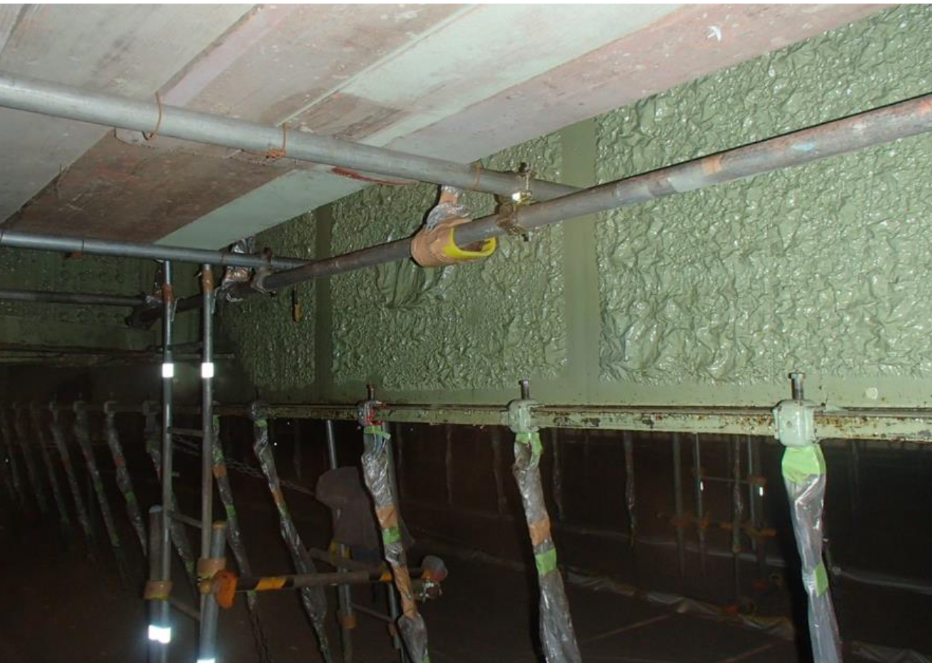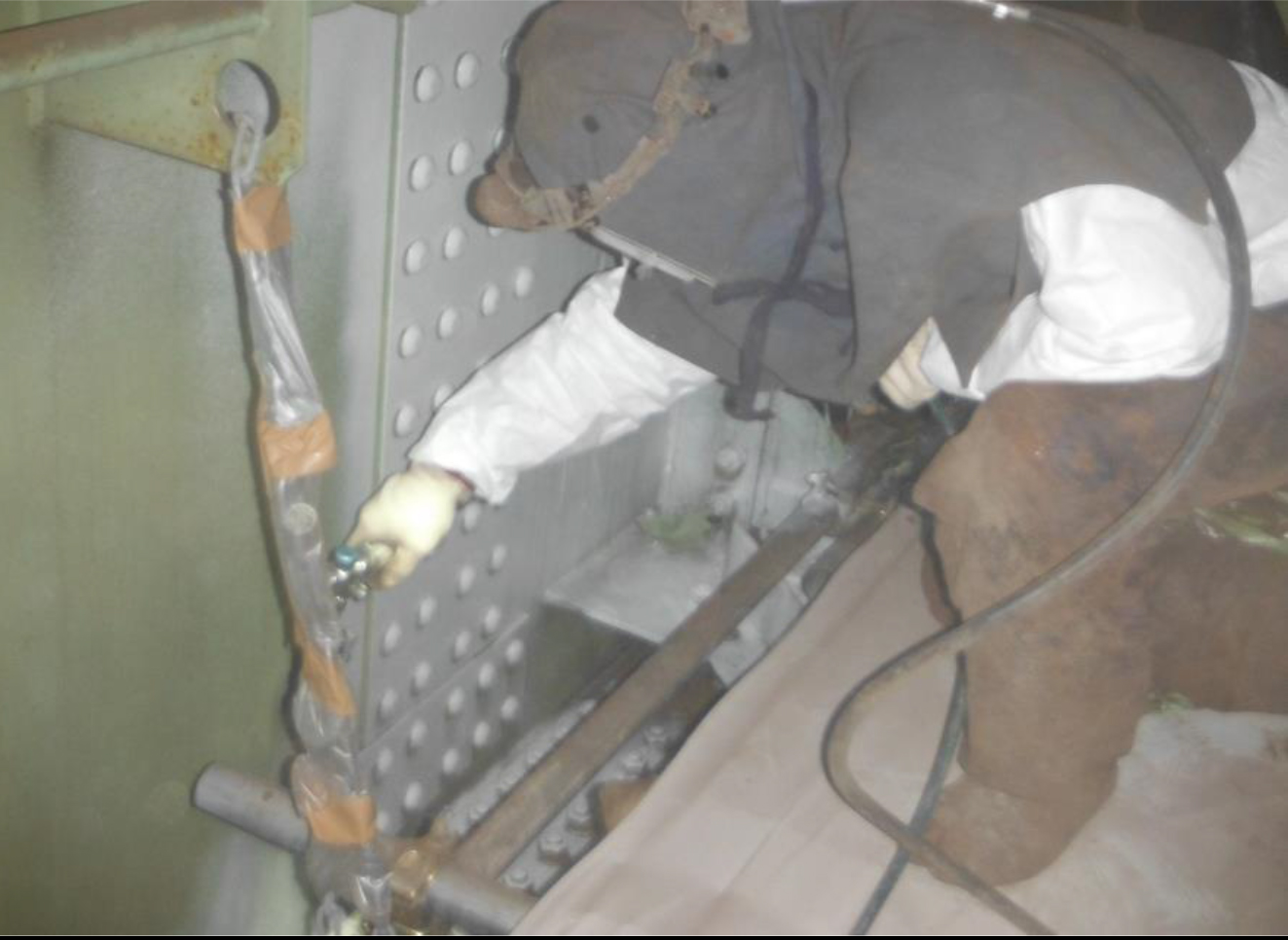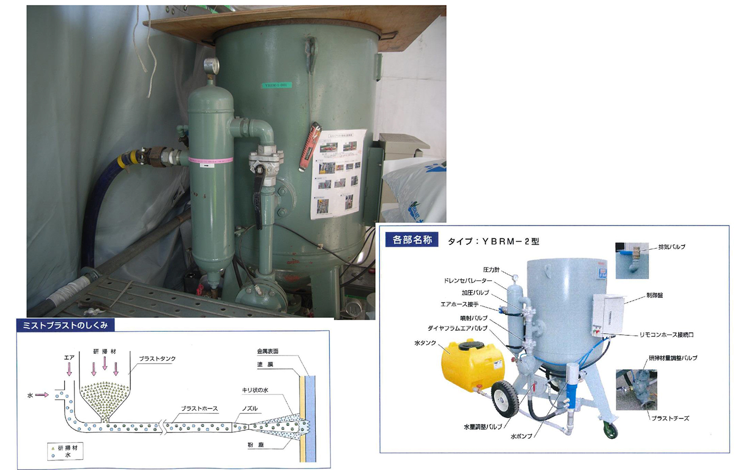 ミストブラスト工法は、ブラストの際、水をごく少量含ませることによって粉塵濃度を抑制する工法で、試験の結果、期待通りに粉塵濃度を下げつつ、隅角部や端部の塗膜を除去し、良好な下地を形成することができた。ケレン材は錆を生じさせないようスチールグリッドは使わず、非鉄金属系の研削材を用いている。水は塗膜滓と混在するが、「現場では防護シートから塗膜カス、水まで全て特別管理廃棄物として廃棄する」ことで法令に基づいた処理を行う。