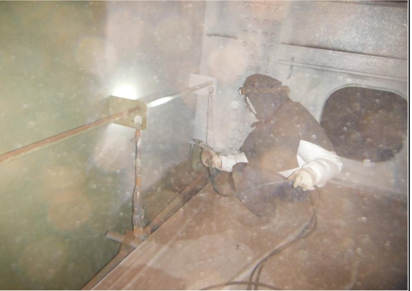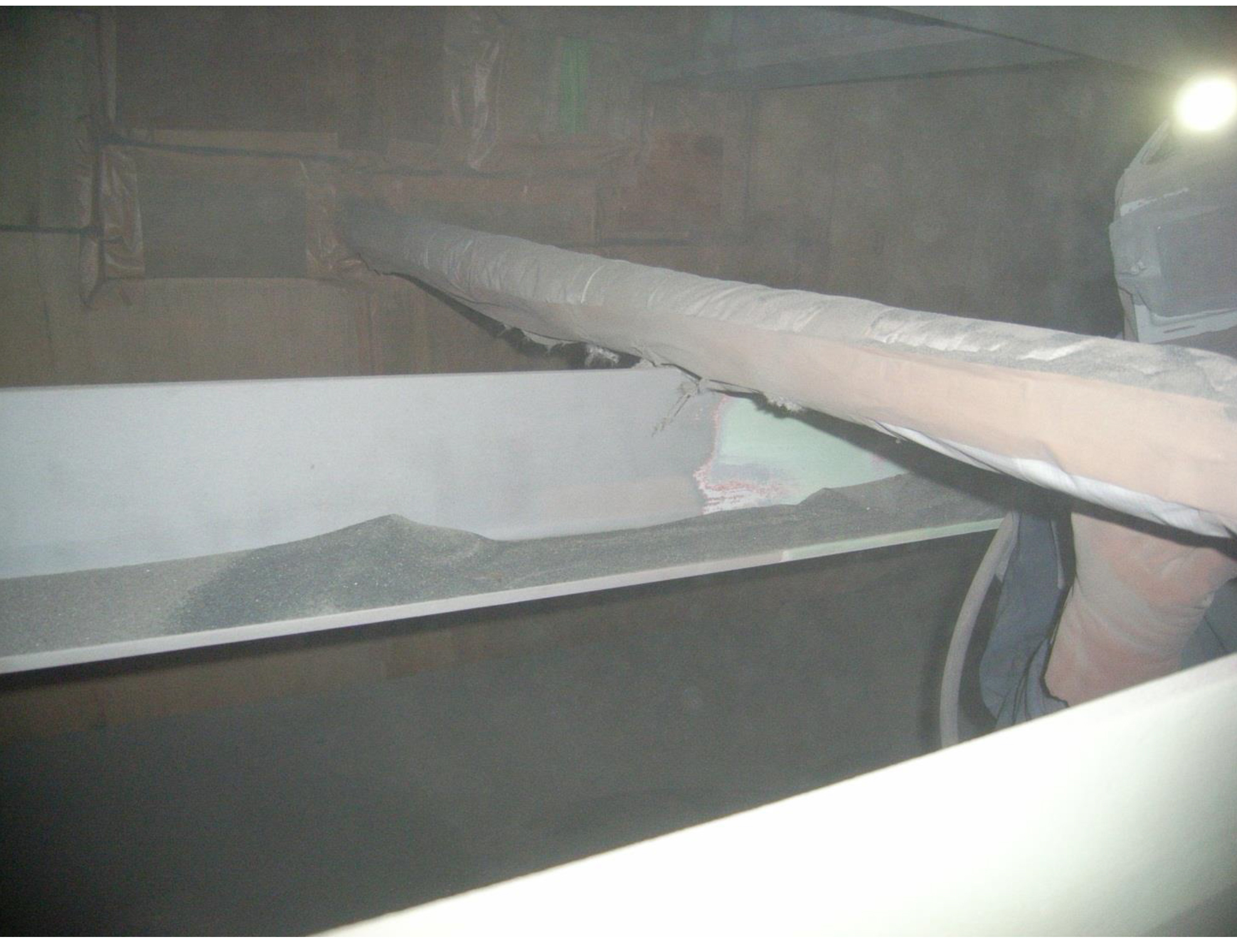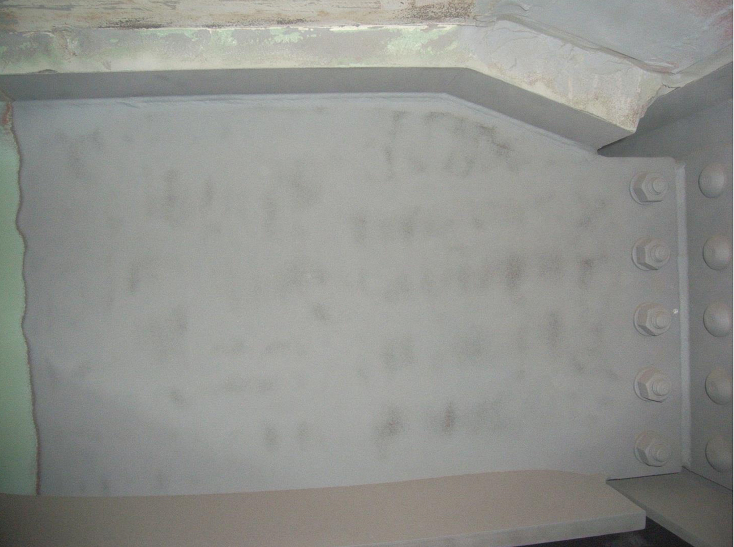ミストブラスト工法は、ブラストの際、水をごく少量含ませることによって粉塵濃度を抑制する工法で、試験の結果、期待通りに粉塵濃度を下げつつ、隅角部や端部の塗膜を除去し、良好な下地を形成することができた。ケレン材は錆を生じさせないようスチールグリッドは使わず、非鉄金属系の研削材を用いている。水は塗膜滓と混在するが、「現場では防護シートから塗膜カス、水まで全て特別管理廃棄物として廃棄する」ことで法令に基づいた処理を行う。