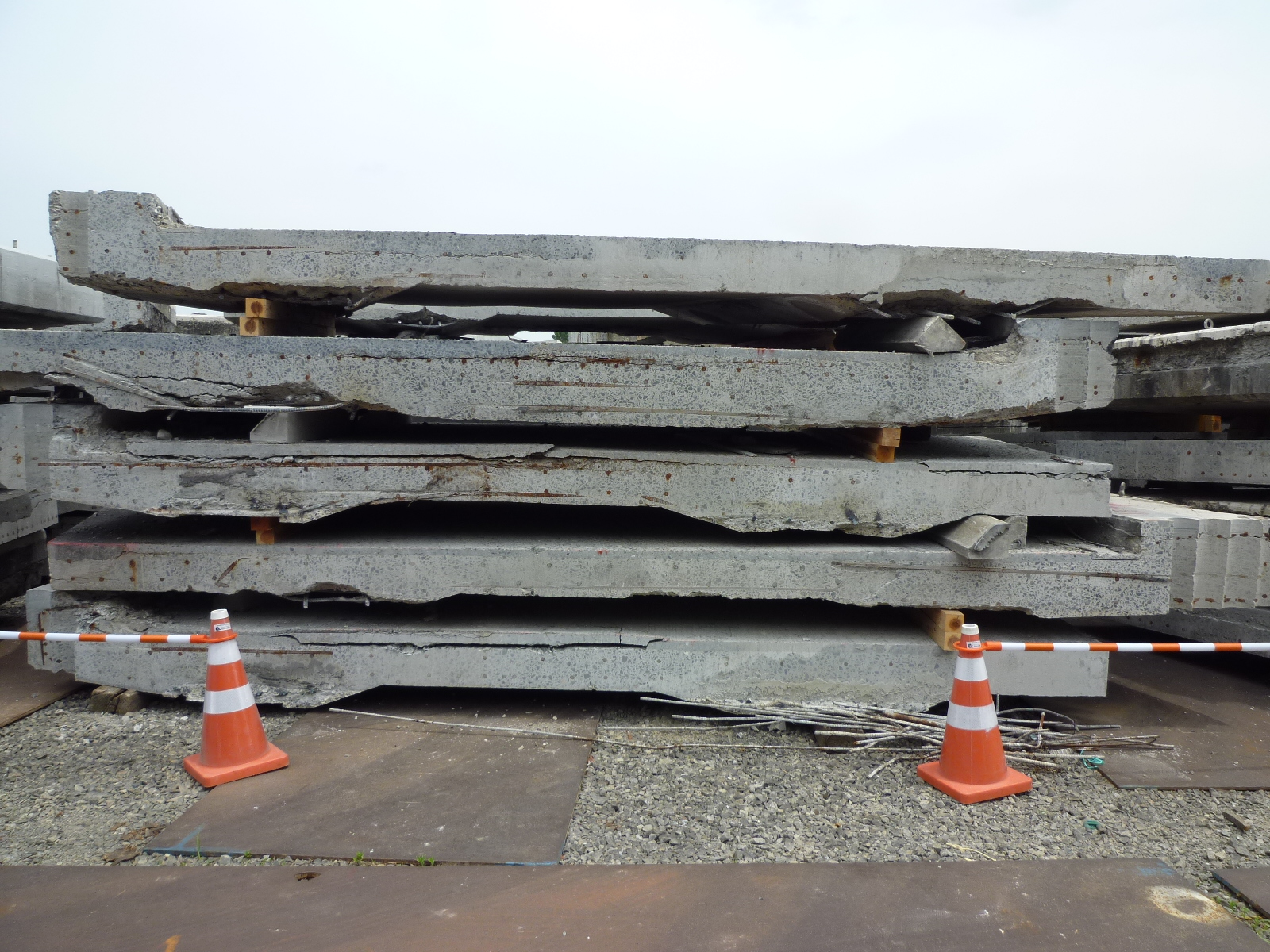 写真(左)仮置きした撤去床版/(右)新設床版の待機状況