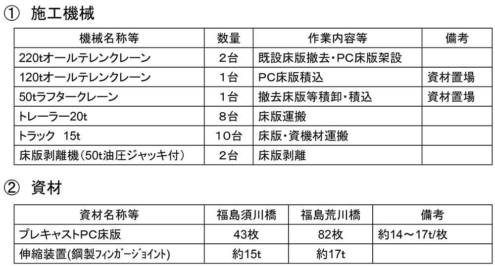 床版の撤去・架設は両橋で1台ずつの220㌧オールテーレンクレーンを使い福島須川橋はA2からA1側、福島荒川橋はA1からA2に施工する。これは搬入・搬出用の出口が、両橋の中間部1箇所しかないためで撤去床版やプレキャストPC床版の搬出入を行うトレーラーの段取りについては輻輳を招かないよう注意を払った。