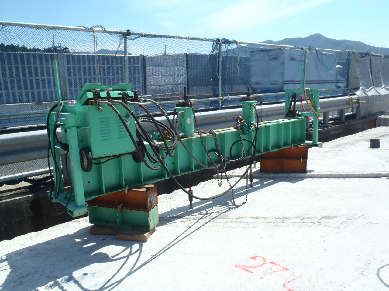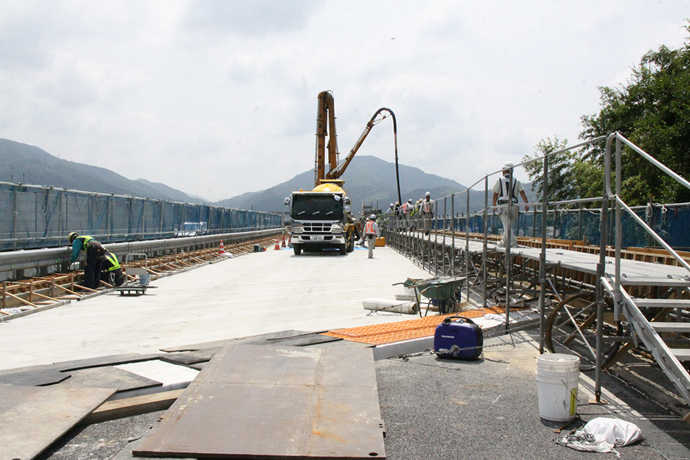 また施工に際しては、「上下線の離隔が2㌢程度と非常に近接した状態にあるため、床版ブロックの製作精度、その後の施工精度、スタッドの位置決め精度などは非常に気を付けた」(同)