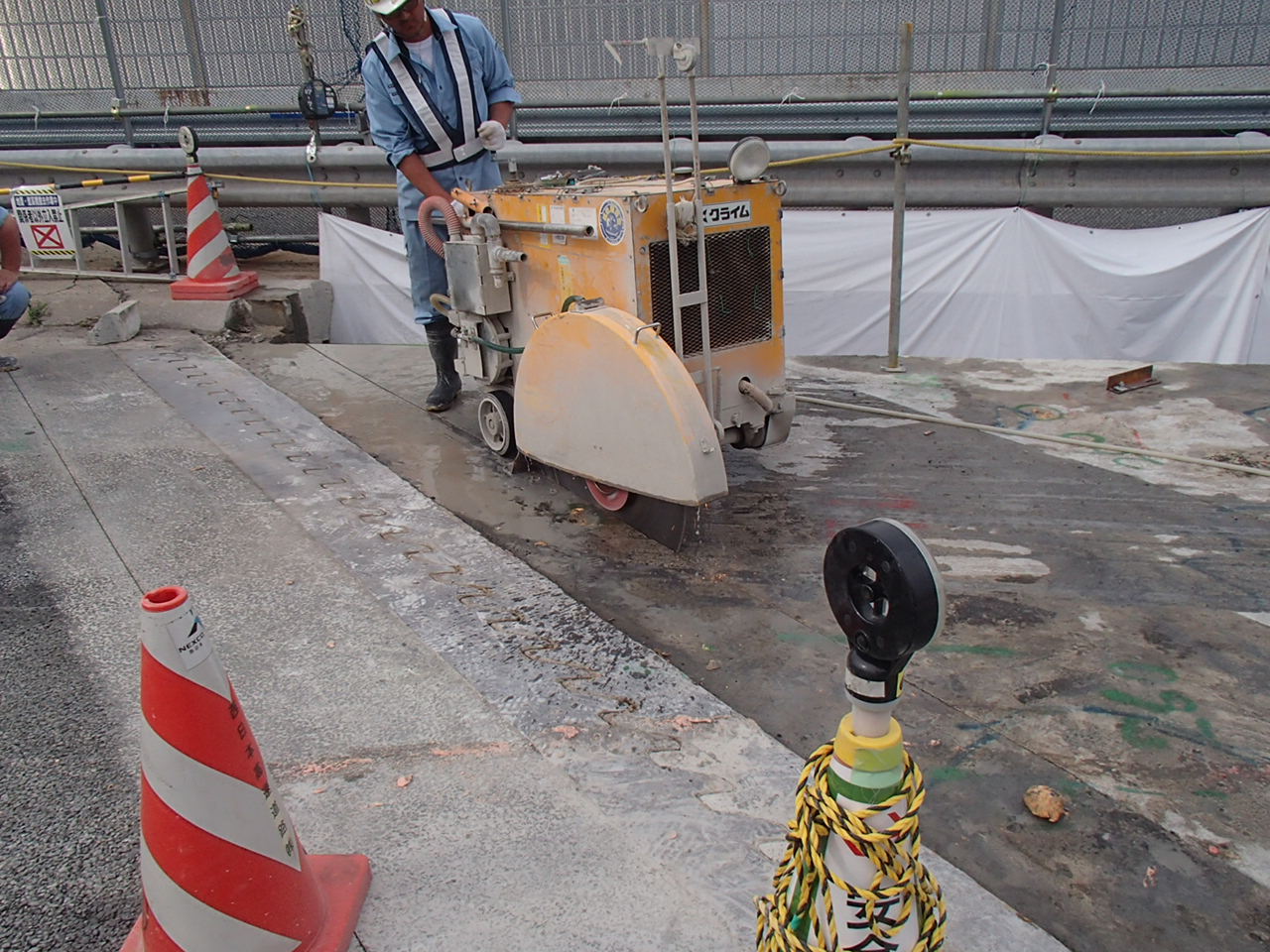 左から、アスファルト舗装切削既設壁高欄切断、既設床版切断