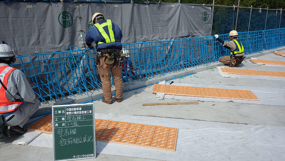(写真左)壁高欄の配筋作業、エポキシ樹脂塗装鉄筋を採用