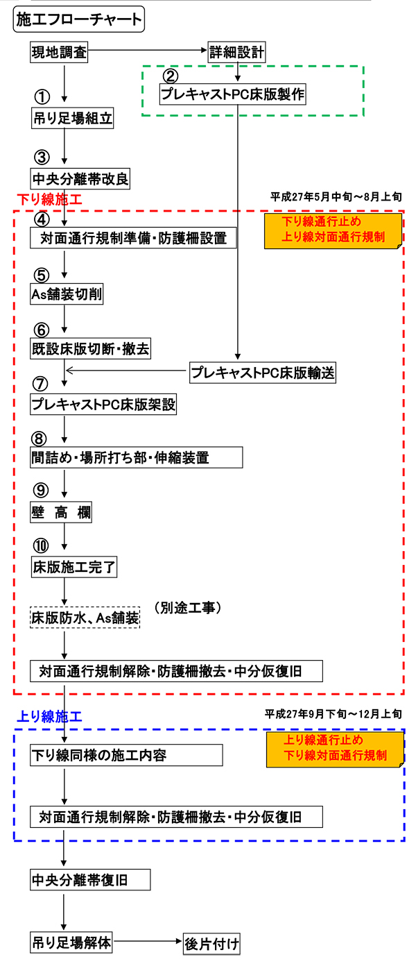 施工手順は左のフローチャート図の通り。施工もさることながら、「施工前の中央分離帯の改良、対面通行規制のため仮設防護柵設置に非常に人員と手間及び注意を要した」(同社)。床版取替えは今回下り線を施工しているが、上り線を対面通行に切り替えた上で下り線の全幅を一括で取り替えている。床版パネルは全部で32本あり、まず既設床版の切断をある程度まで(桁上面の定着部はく離以外を終わらせた状態)行った後に、プレキャストパネルを搬入し油圧ジャッキで4本程度を縁切りし、220㌧オールテーレンクレーンで既設床版を撤去し新しい床版パネルを4本架設するという工程を繰り返して施工する。撤去切断はコンクリートカッターで行うが、勢いあまって鋼桁を切断しないよう事前の対策を徹底するとともに、床版の上下から施工を監視するなど細心の注意を払った。