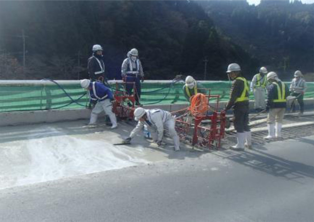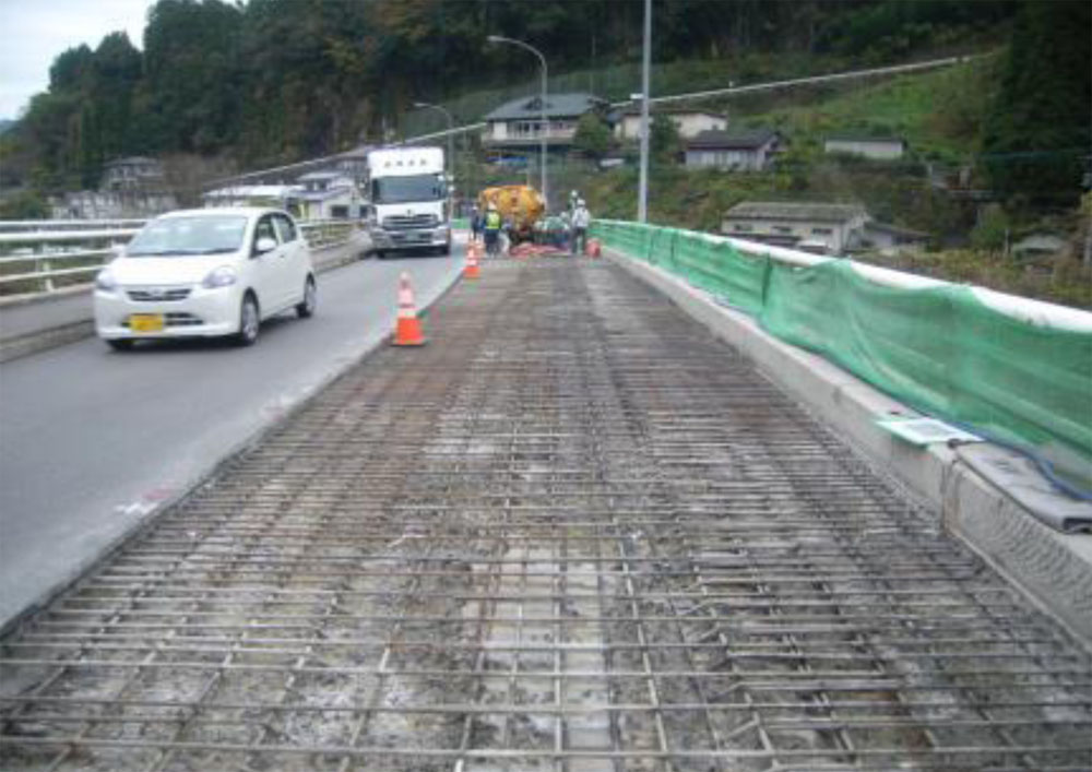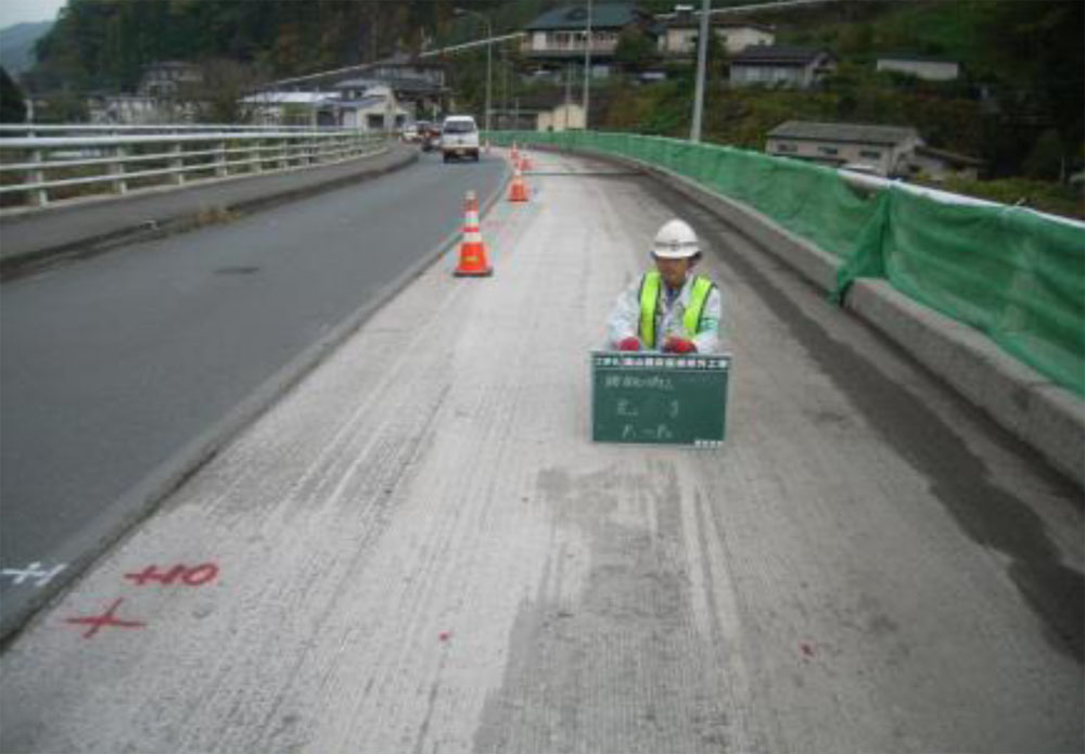 新旧コンクリートの付着面は接着剤および防水層の塗布は特に行っていない。新旧コンクリートの強度差によるたわみによって界面の剥離が起きないよう、母材は床版下面よりひび割れ注入および断面修復工を行っており、22~24N/平方㍉の強度を確認している。上面に138㍉の厚さを1回の打設で施工するため、スランプ15㌢を確認した上で打設した。なお打設後はコンクリート舗装面に箒目仕上げを実施し、車両のすべり抵抗性を向上させている。